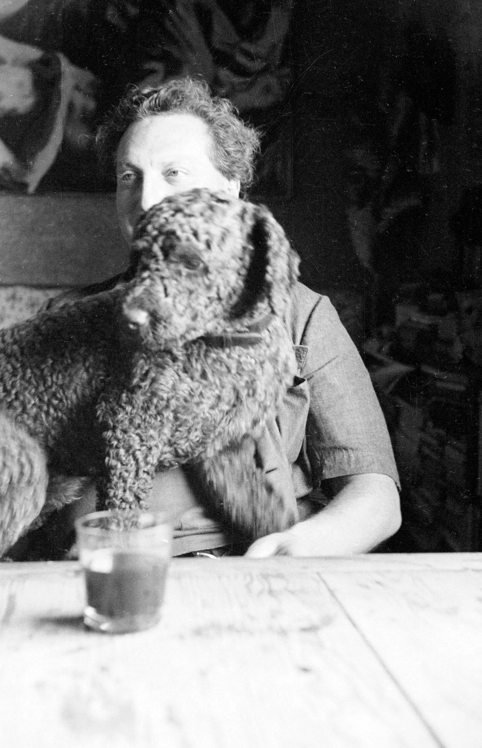 Black and white photograph of a person seated at a wooden table holding a curly-haired dog in front of their face, with a glass on the table