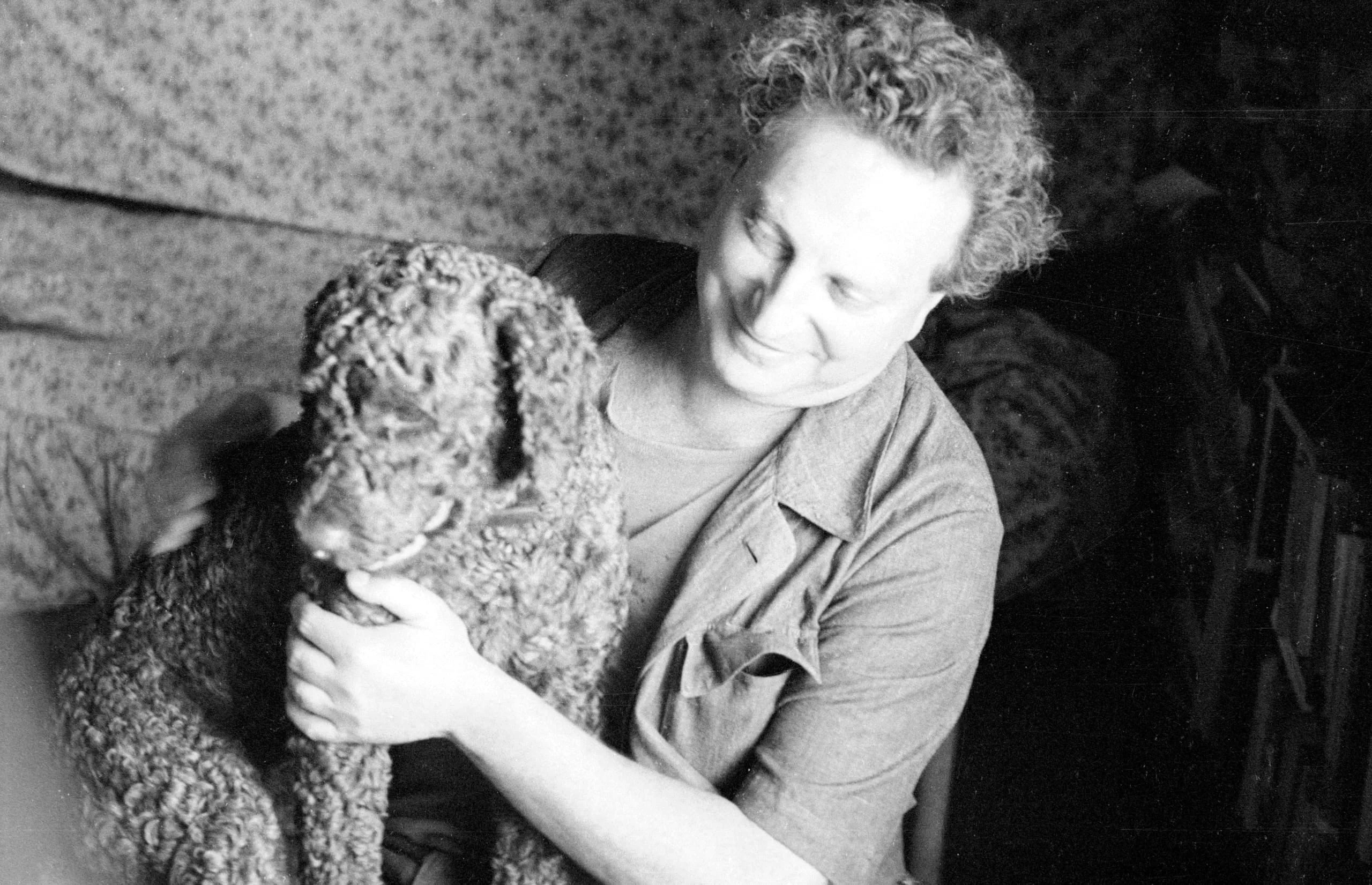 Black and white photograph of a white woman with curly hair smiling and embracing a large curly-coated dog, indoors
