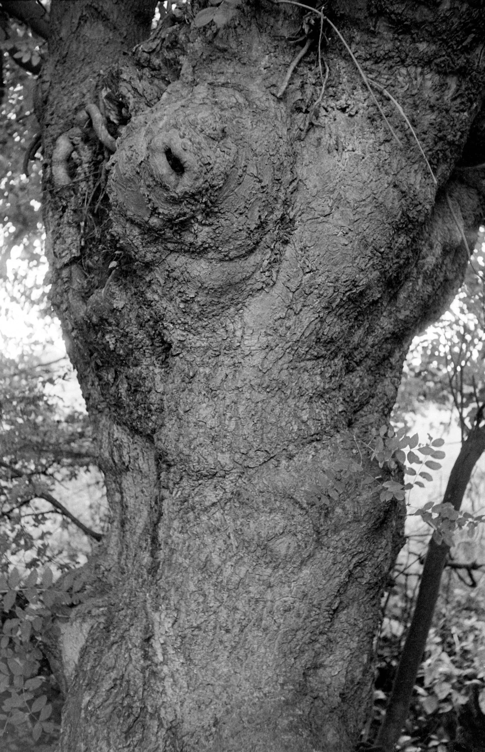 Black and white photograph of a large, gnarled tree trunk with deeply furrowed bark and a prominent burl, surrounded by out-of-focus foliage