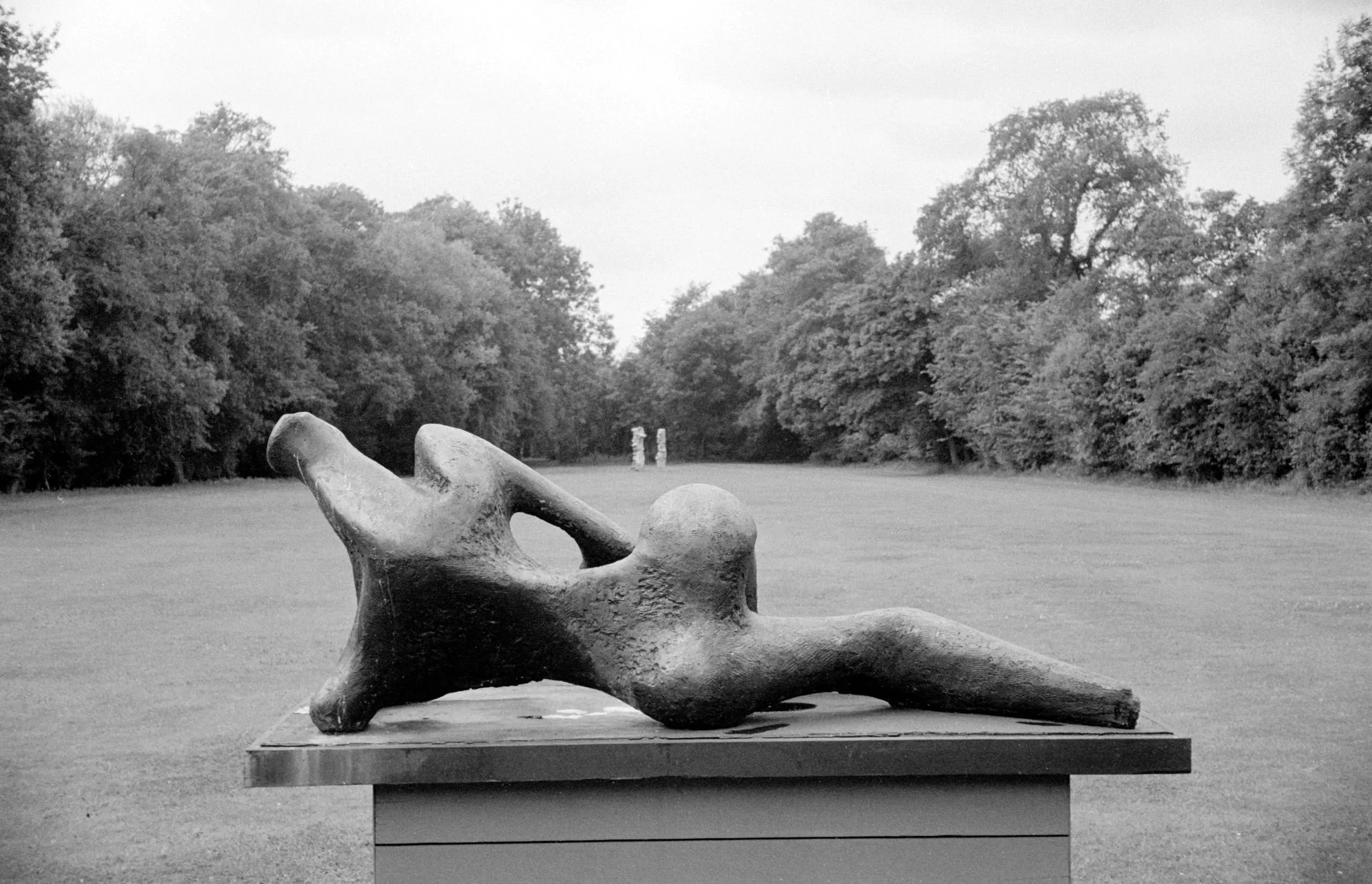 Large bronze sculpture of an abstracted reclining figure with a rounded head, open void in the torso, and rough textured surface, displayed on a plinth outdoors on a lawn
