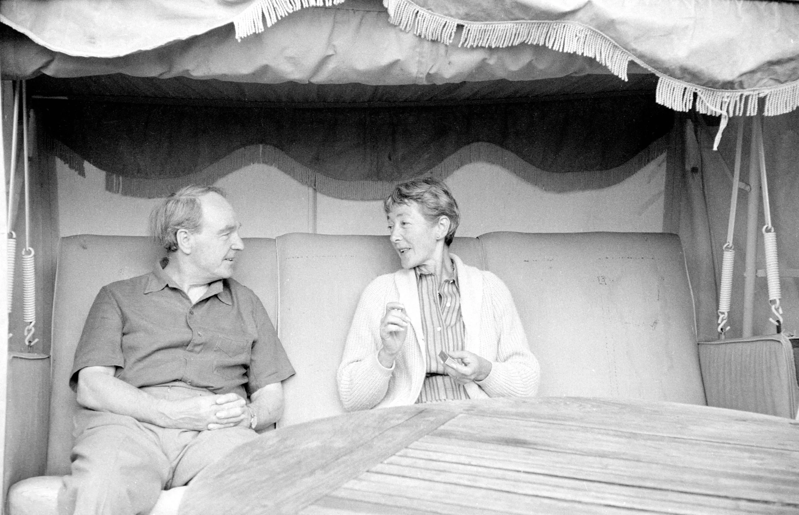 Black and white photograph of a man and woman seated inside a fringed beach cabana, turned toward each other in conversation at a wooden slatted table