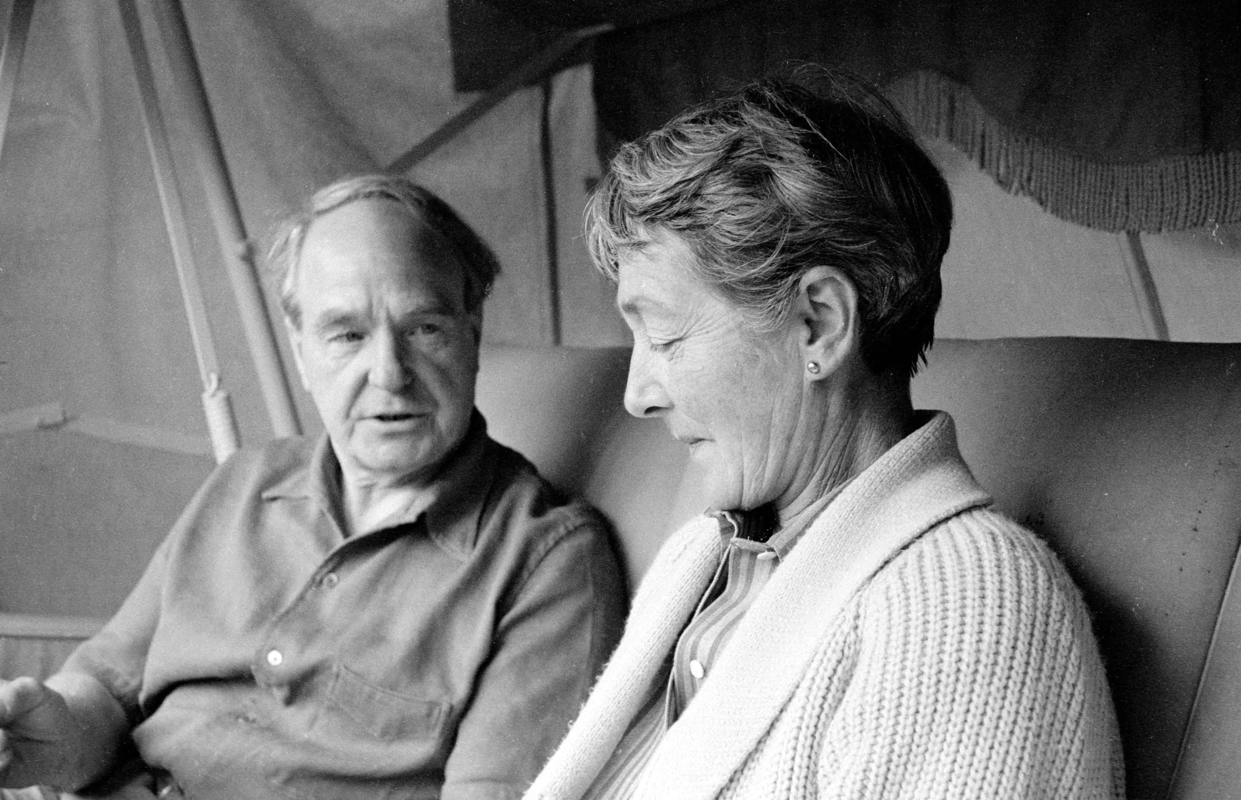 Black and white photograph of an older man and woman seated together from the chest up inside a tent, soft diffused lighting
