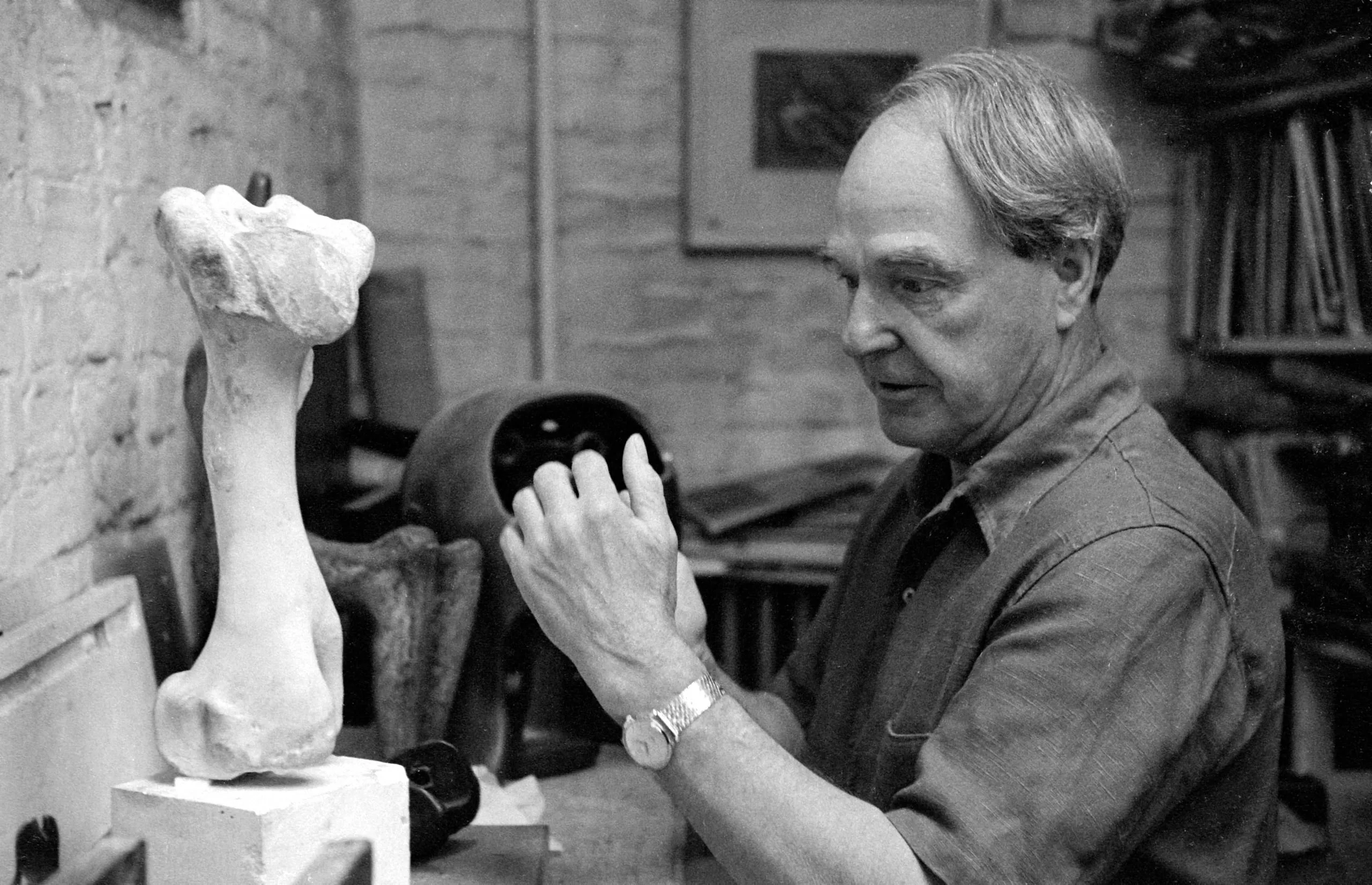 Black and white photograph of a man in a short-sleeved shirt examining an abstract plaster sculpture on a worktable in an artist's studio