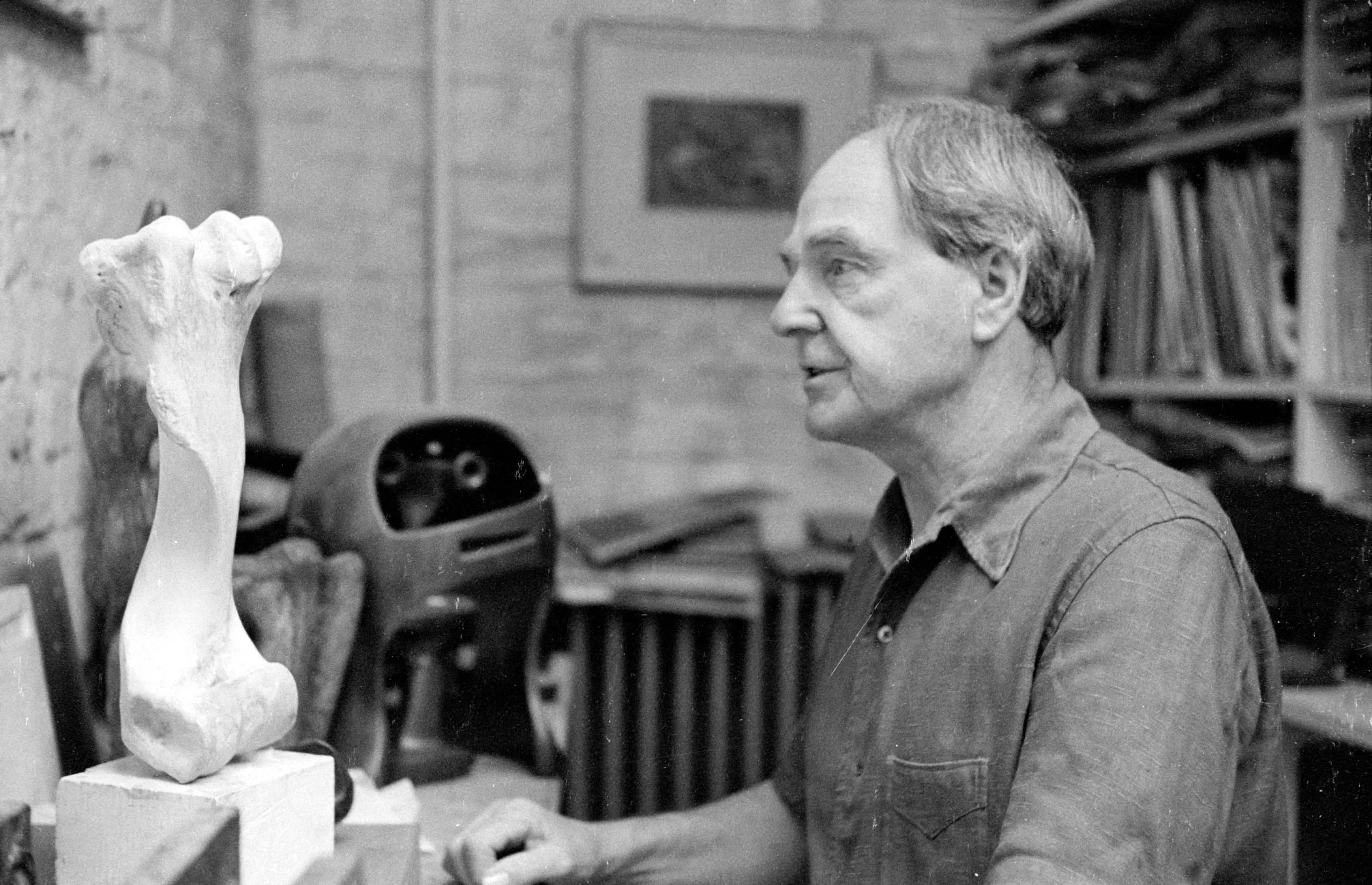 Black and white photograph of a man in profile in an artist's studio, looking toward an abstract plaster sculpture on a pedestal