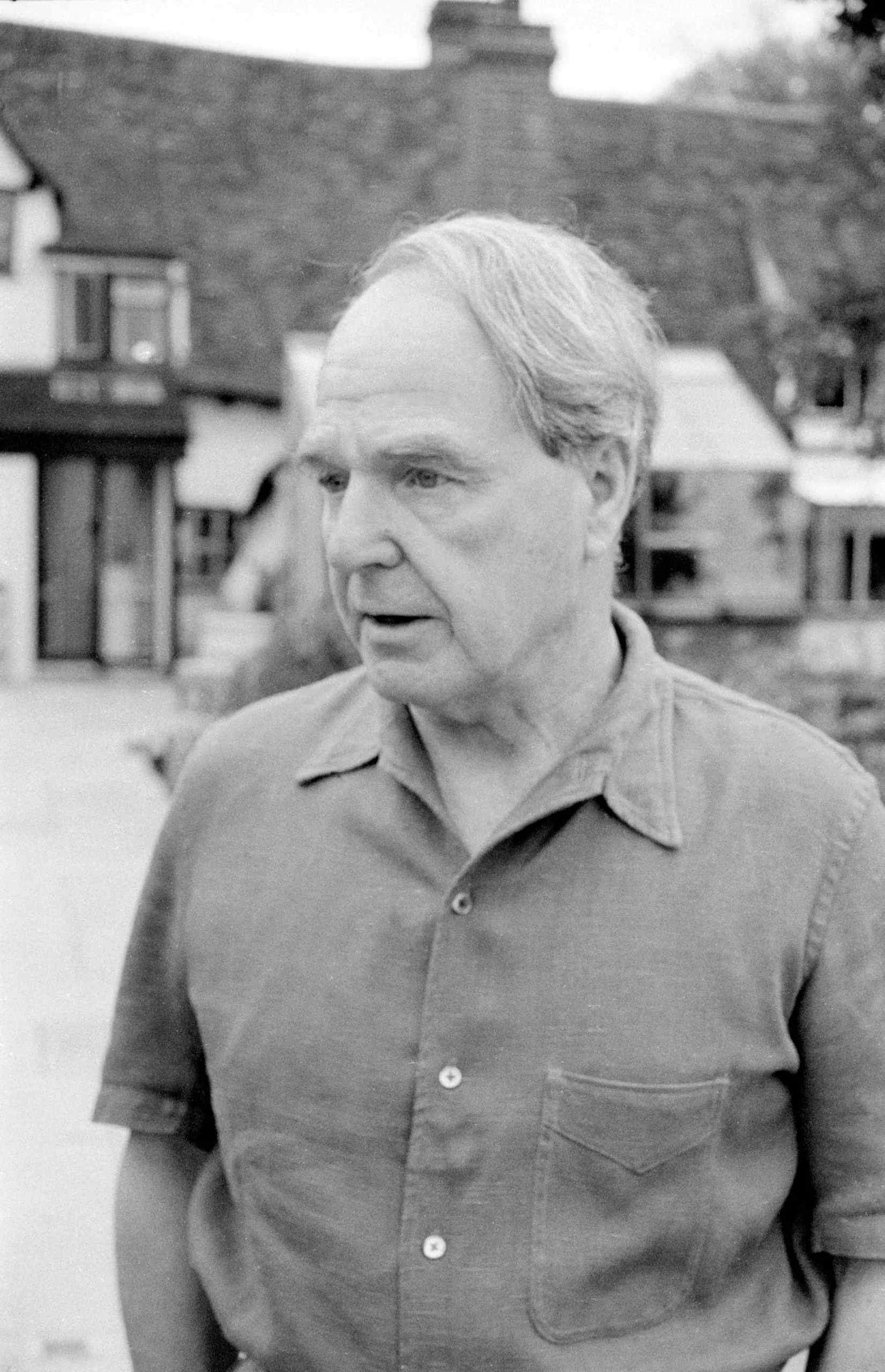 Black and white photograph, chest-up portrait of an older white man with thinning white hair, wearing a short-sleeved collared shirt, looking to his left outdoors