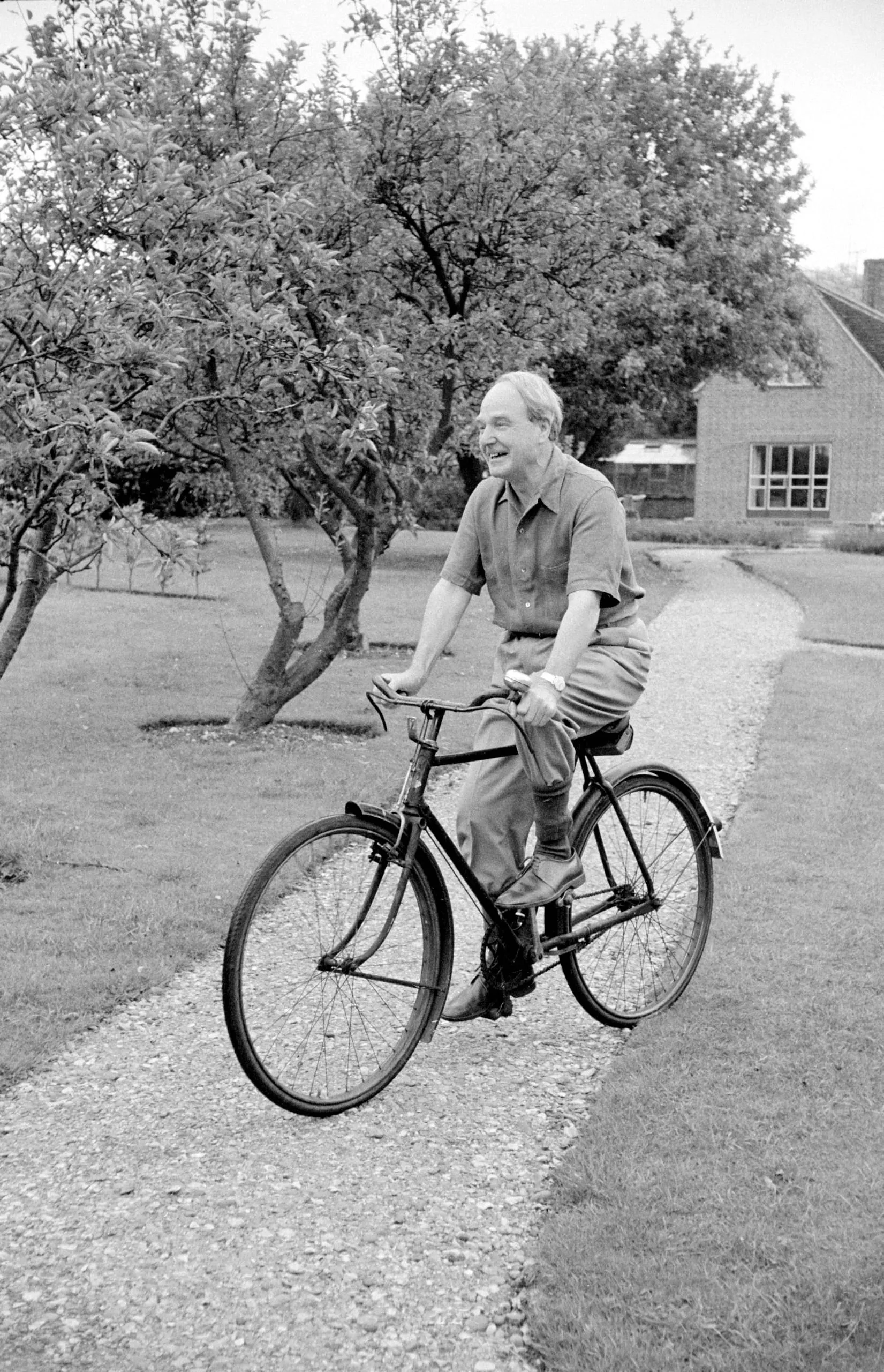 Black and white photograph of an older white man smiling while riding a bicycle along a gravel path, with trees and a brick building in the distance