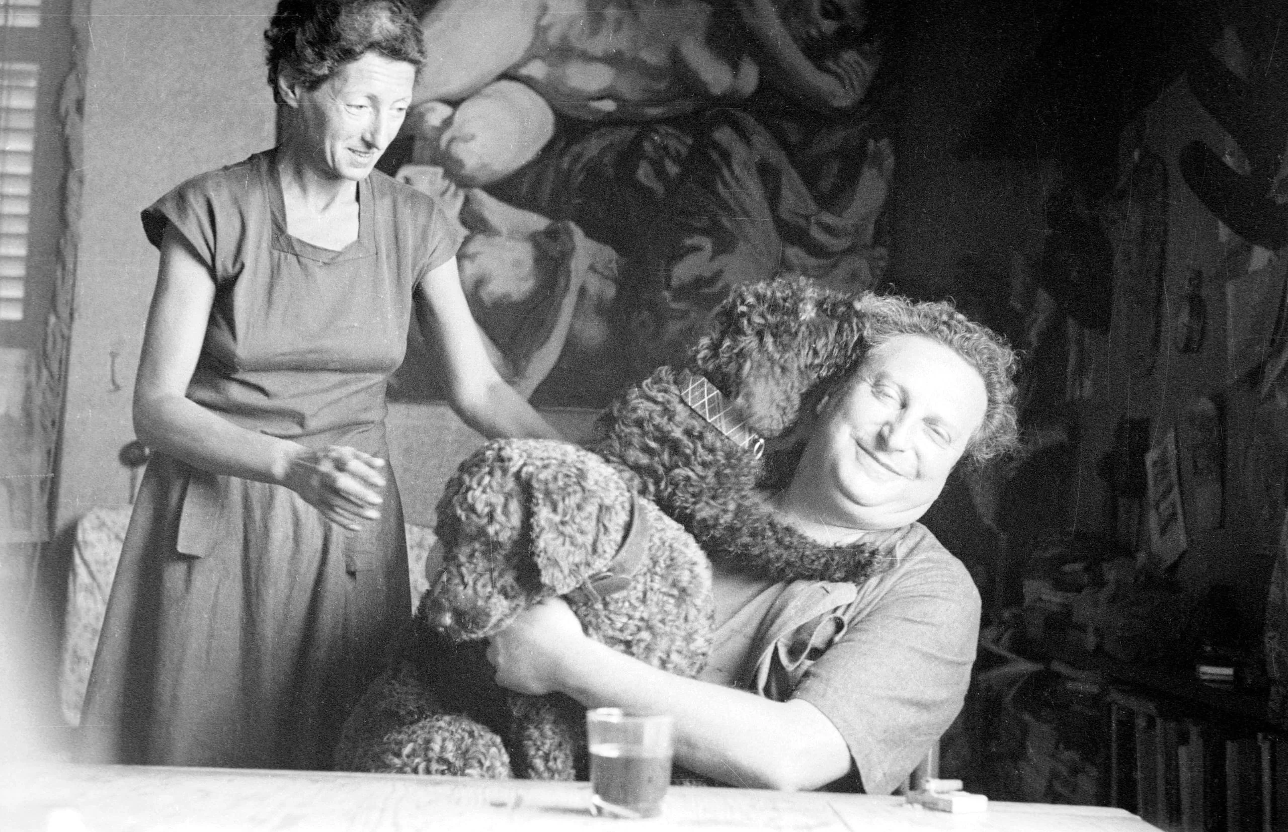 Black and white photograph of two women with two curly-haired dogs in an artist's studio, large painting visible on the wall behind them