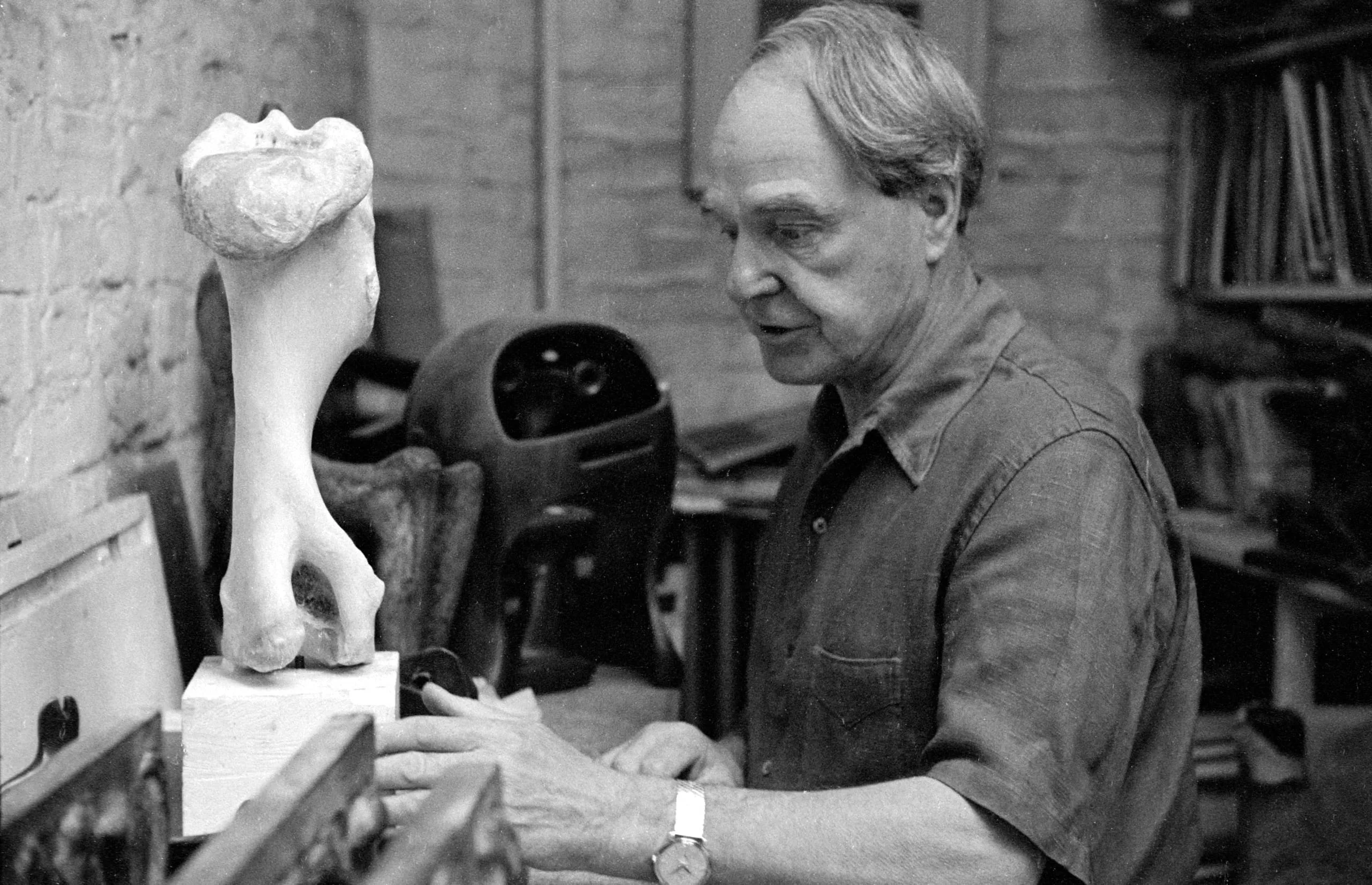 Black and white photograph of a man in a short-sleeved shirt working in a studio, leaning over a worktable beside a small pale abstract sculpture on a wooden block