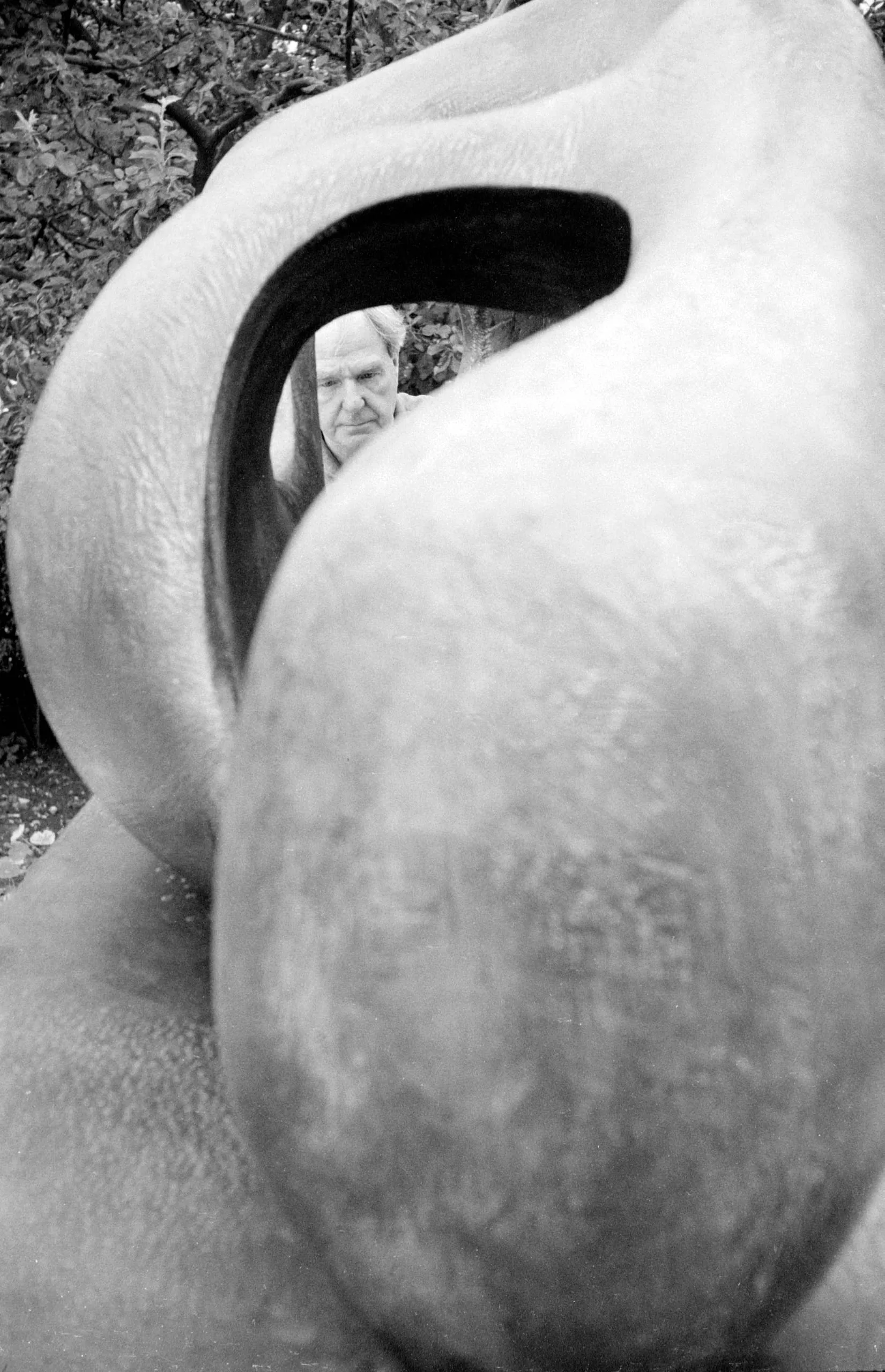 Black and white photograph of a large biomorphic sculpture shot from below, with a man's face visible through an oval void in the curved stone form, leafy trees behind