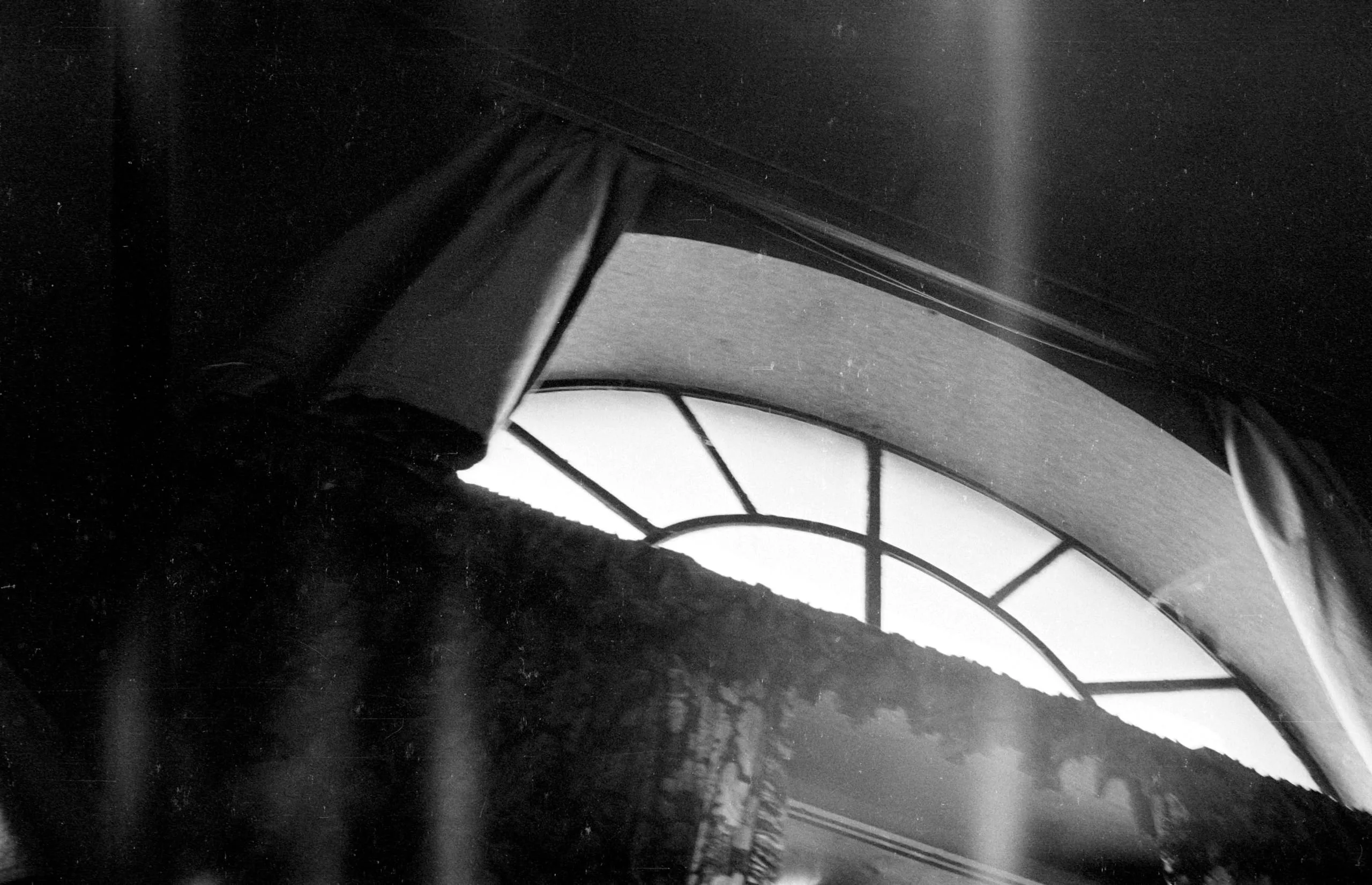 Black and white photograph looking up at an arched fanlight window framed by heavy dark curtains, high contrast with deep shadows and bright overexposed glass panes