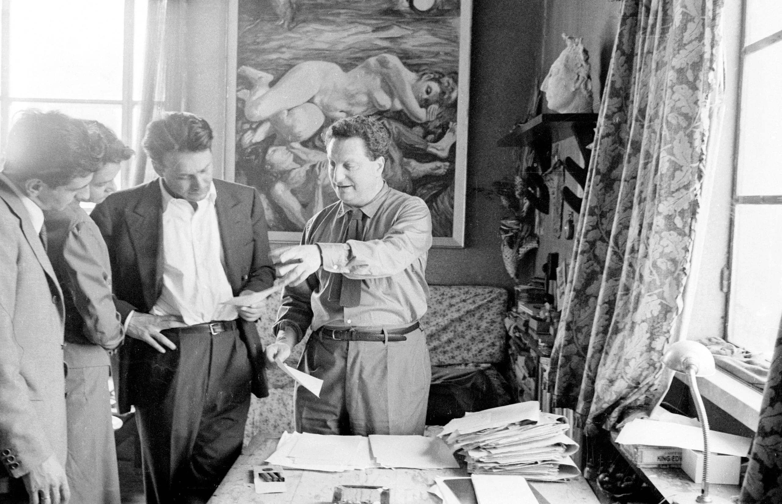 Black and white photograph, three men gathered around a cluttered desk in a studio, one gesturing with papers, a large figurative painting visible on the wall behind them