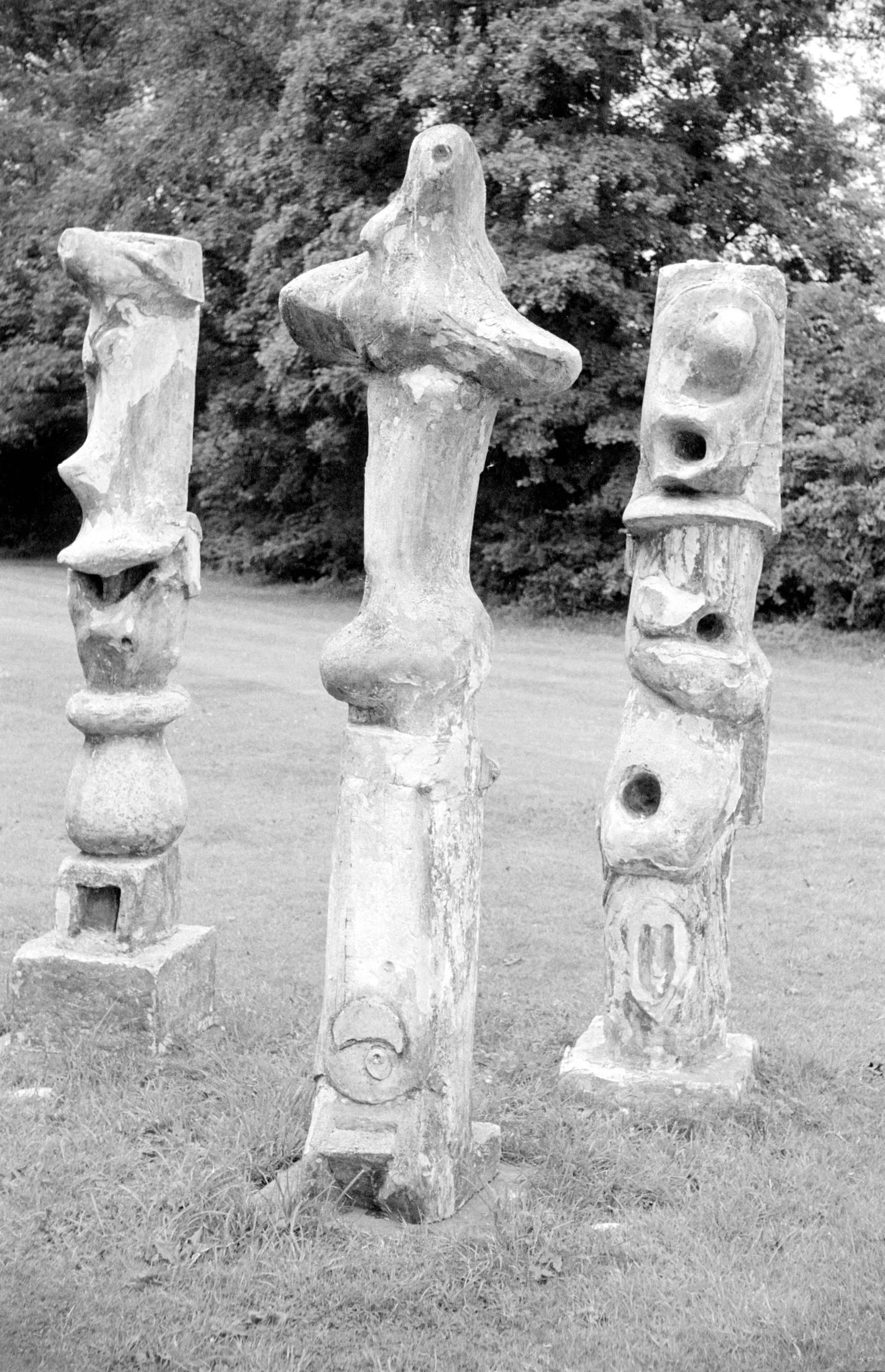 Black and white photograph of three tall, weathered vertical sculptures with biomorphic and geometric carved forms, standing on a grass lawn