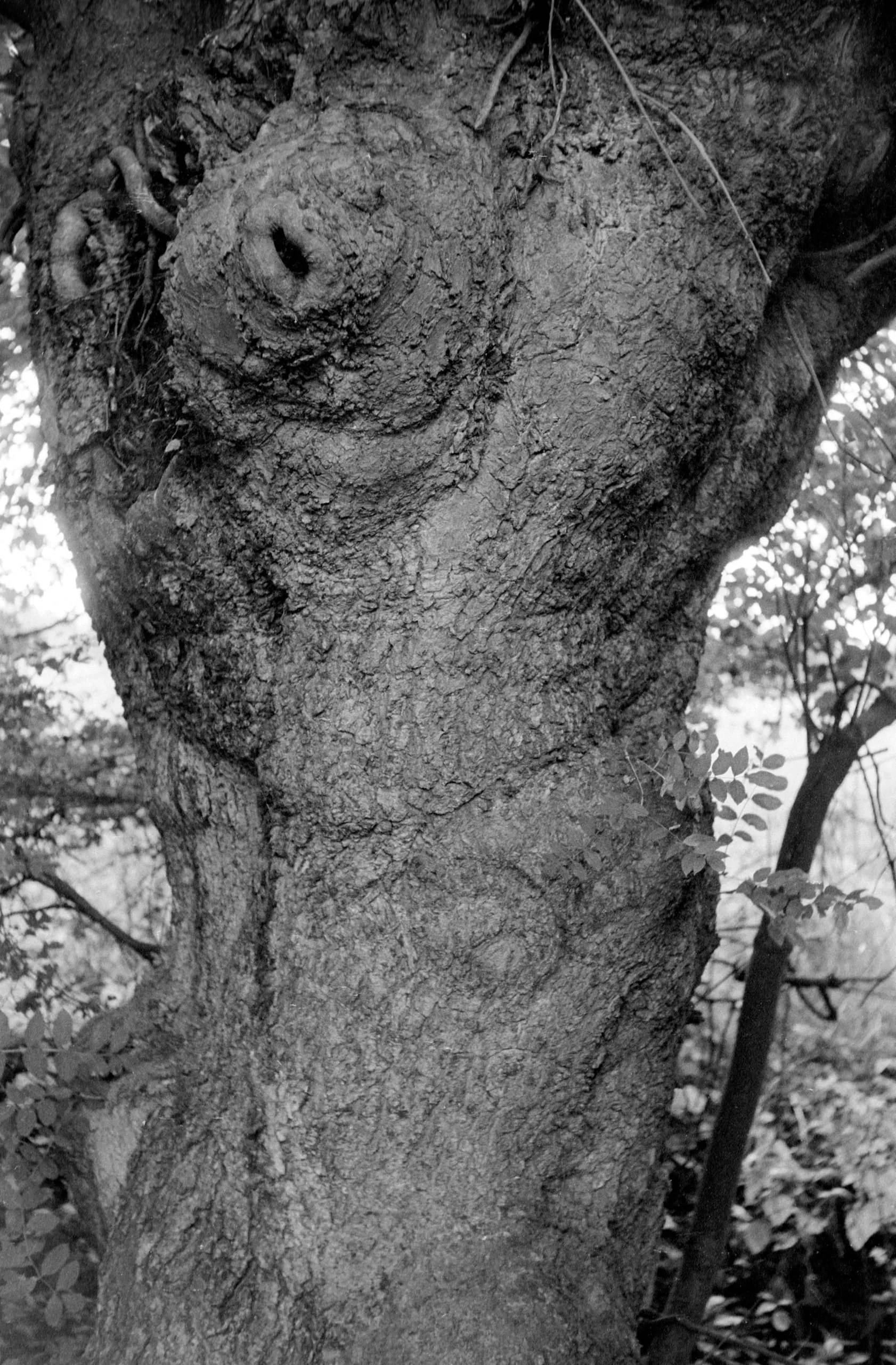 Black and white photograph of a massive, gnarled tree trunk filling the frame, with deeply furrowed bark and a prominent burl with a spiral, eye-like formation