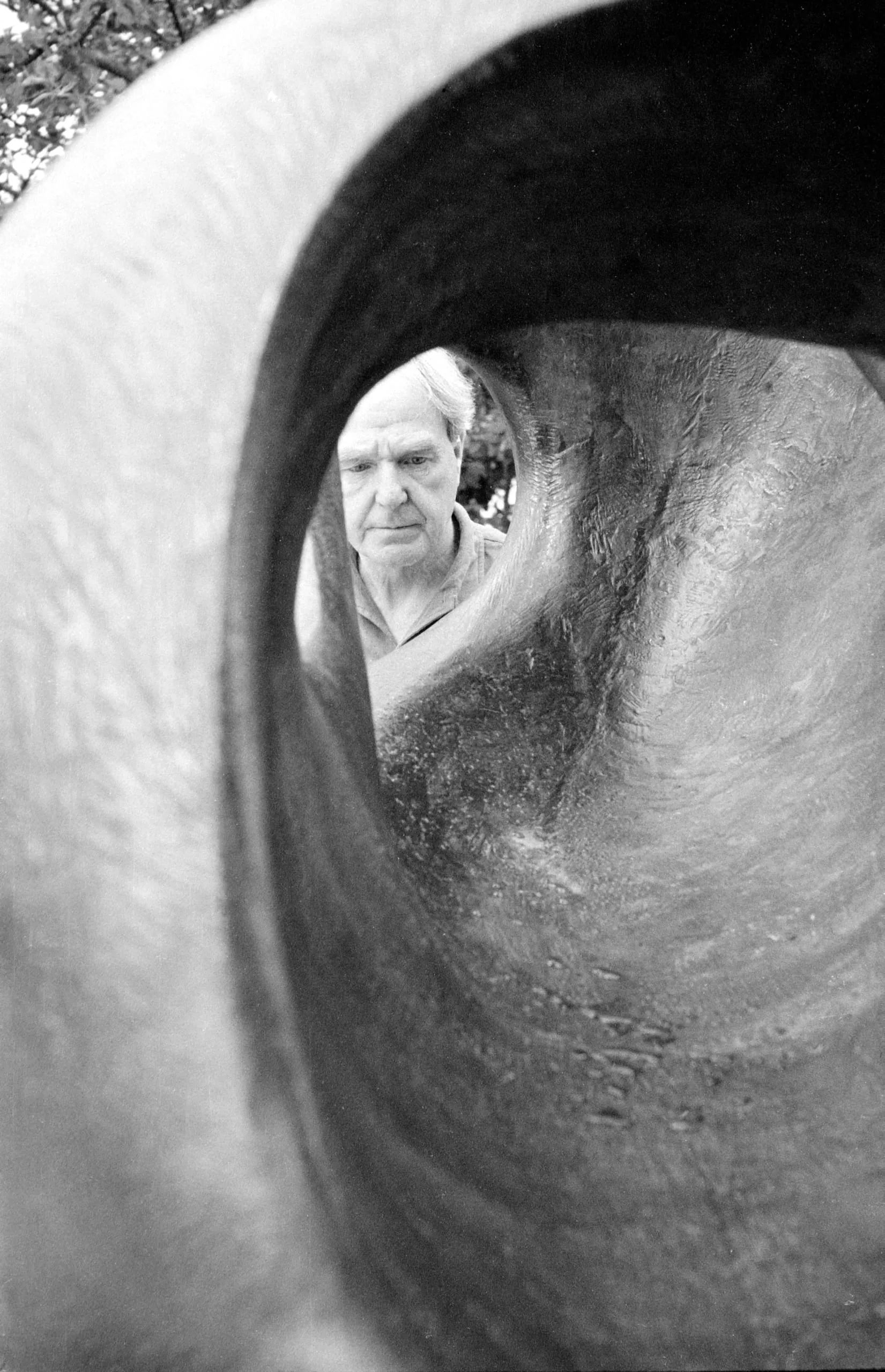 Black and white photograph of an older man's face seen through the circular opening of a large textured sculpture, with the curved interior wall filling most of the frame