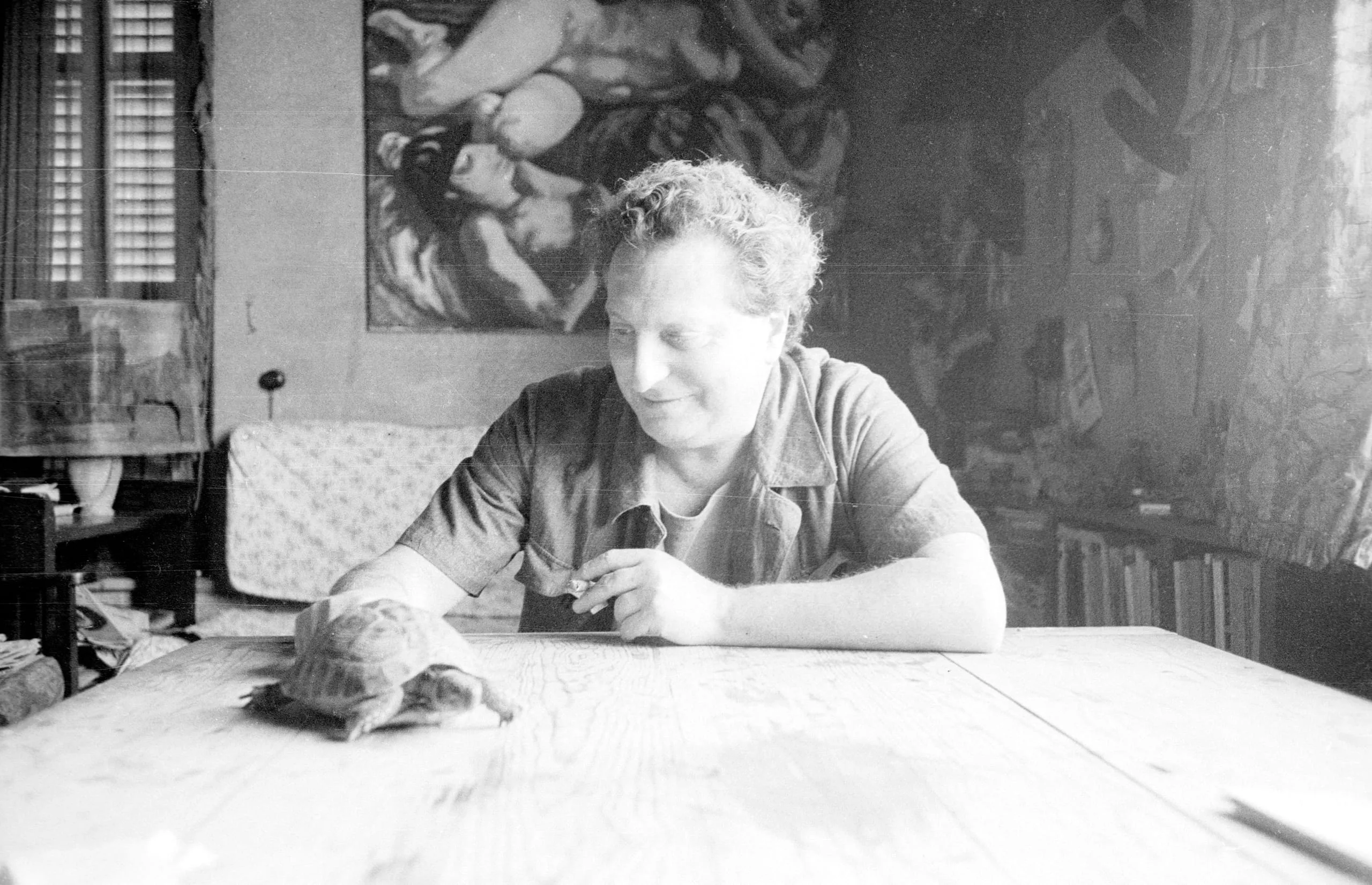 Black and white photograph of a curly-haired person in a short-sleeved shirt leaning over a wooden table, looking down at a small tortoise, with a large figurative painting visible on the wall behind