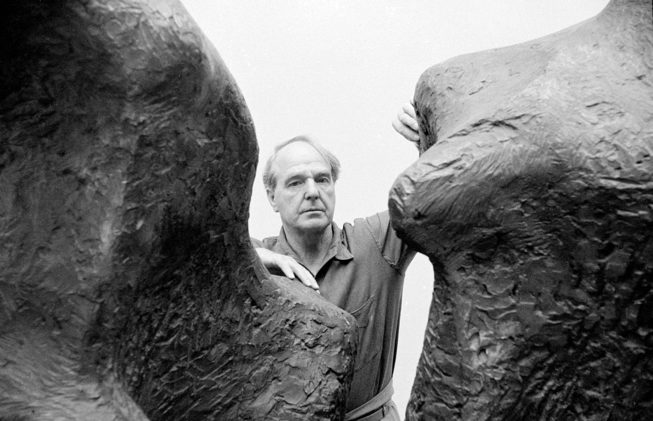 Black and white photograph of a man framed between two large, rough-textured organic sculptural forms, his hands resting on each