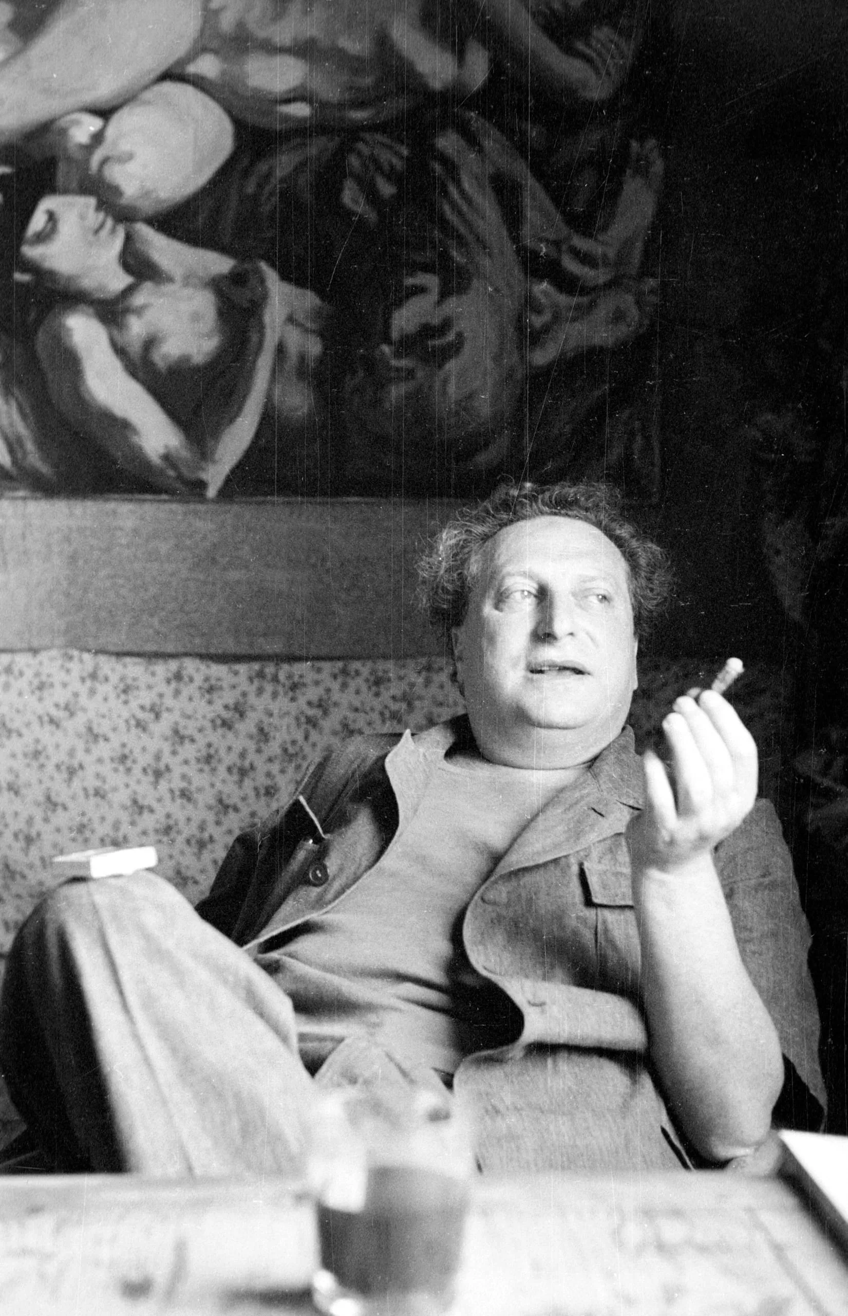 Black and white photograph of a man reclining on a sofa, lips parted, holding a cigarette, with a large figurative painting visible on the wall behind him