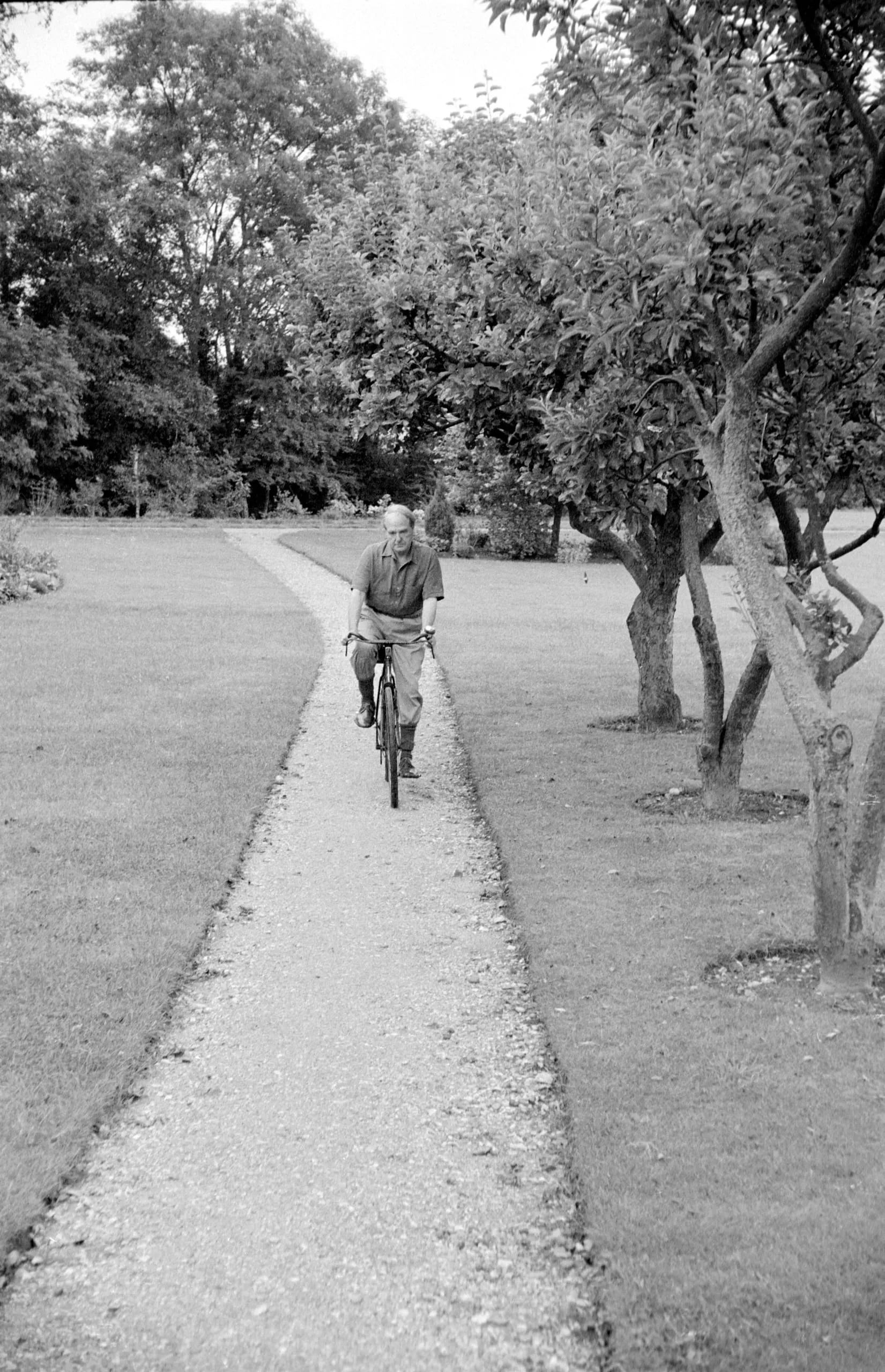 Black and white photograph of an older man riding a bicycle toward the camera along a narrow gravel garden path lined with grass lawns and small trees