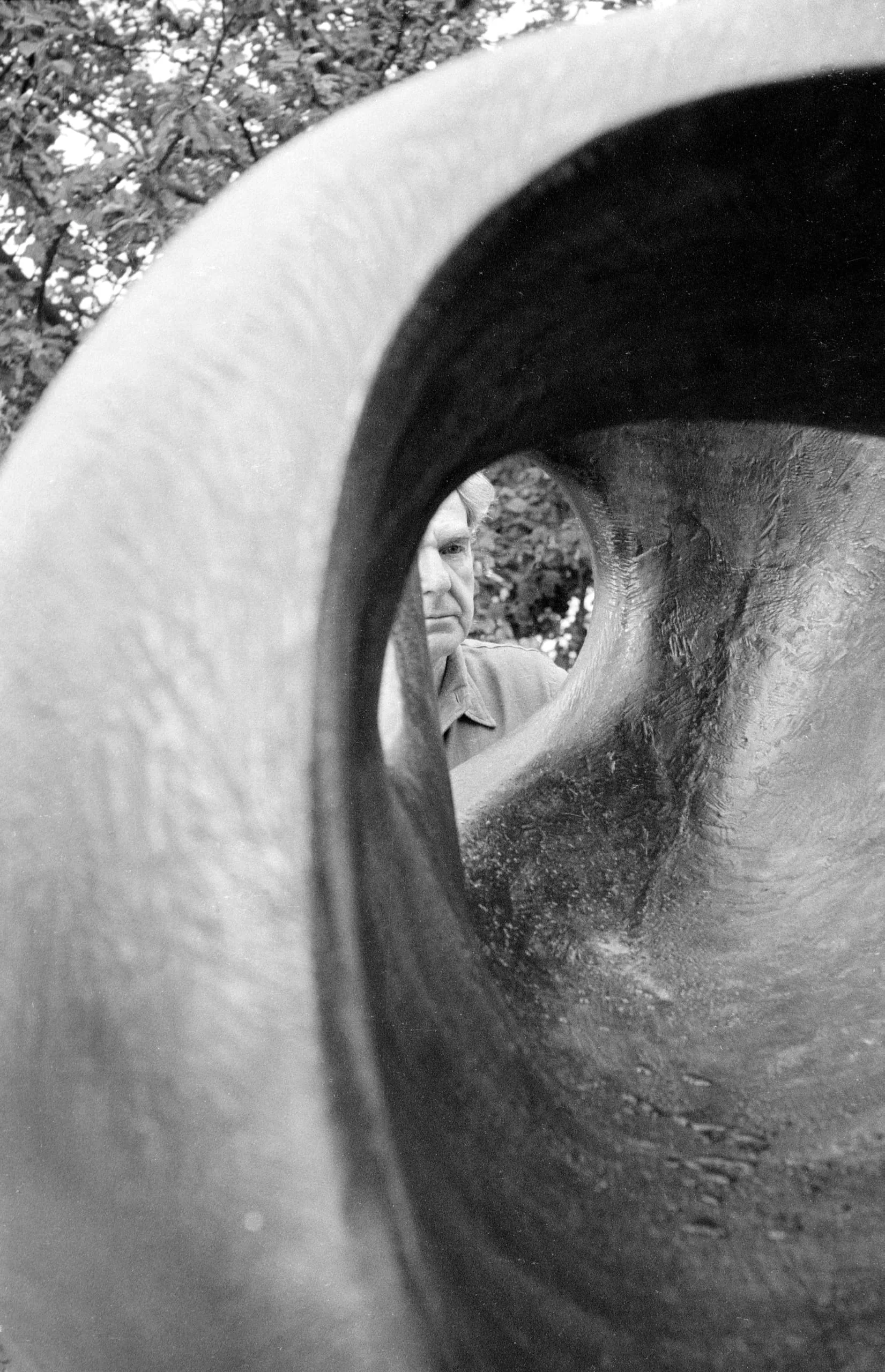 Black and white photograph looking through the hollow tunnel of a large curved sculpture, a man in a collared shirt visible through the opening with trees behind him