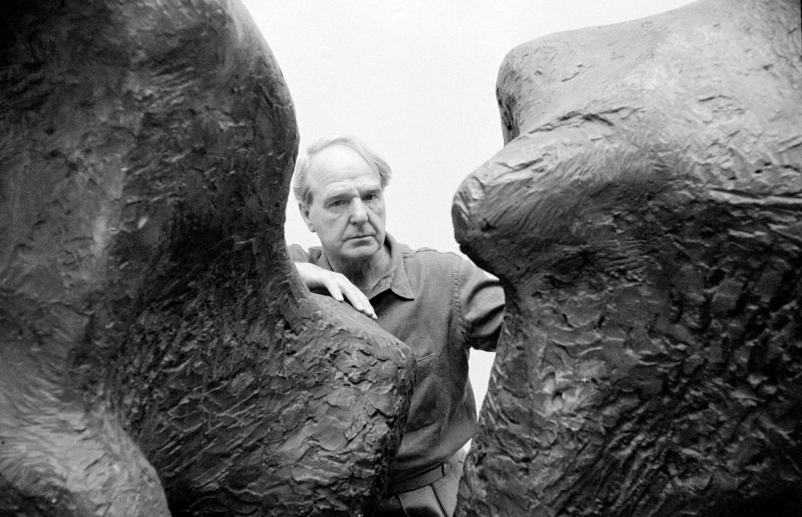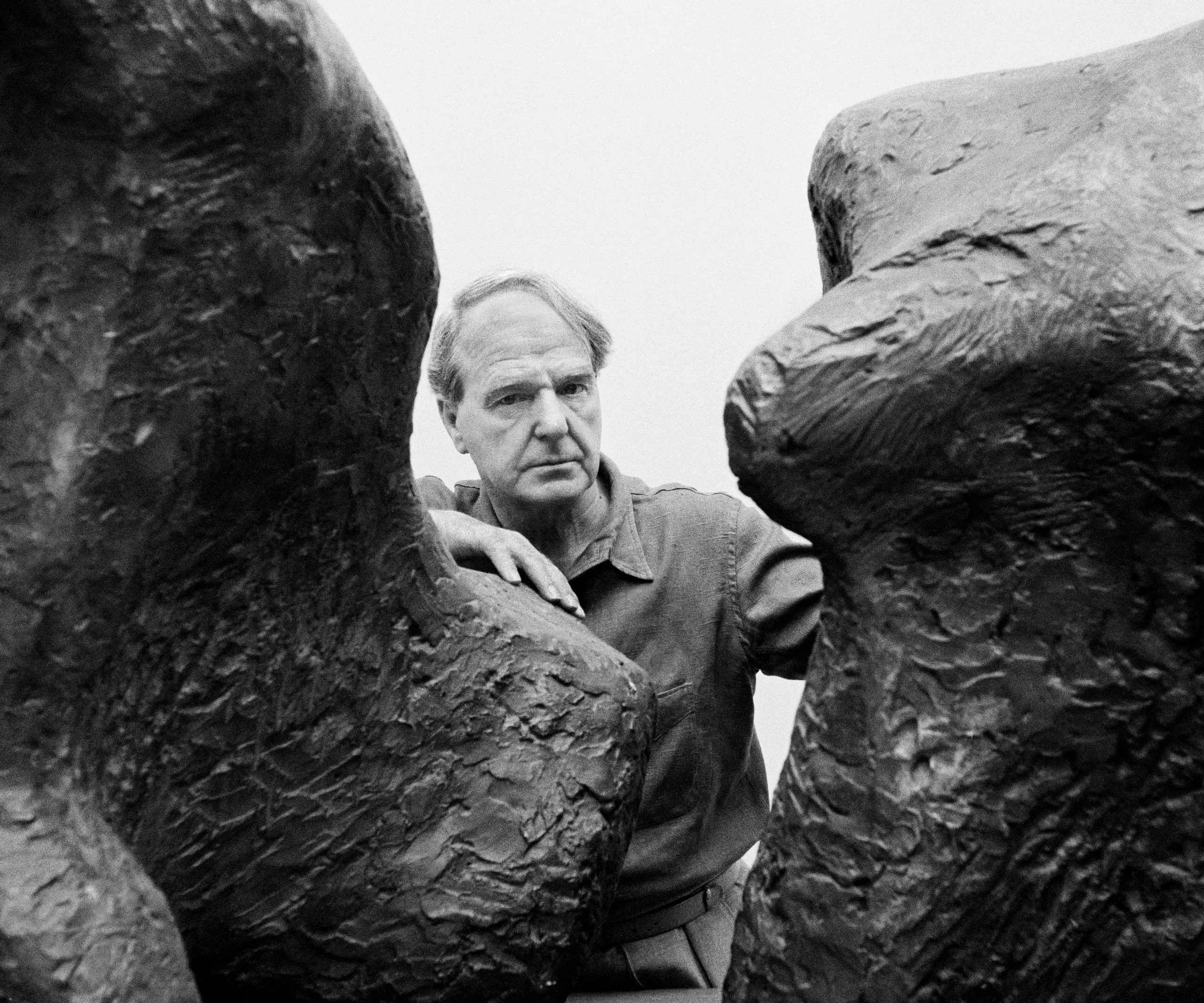 Black and white photograph of a man in a collared shirt framed between two large bronze sculptures with heavily textured surfaces, his hand resting on one form, overcast sky behind him.