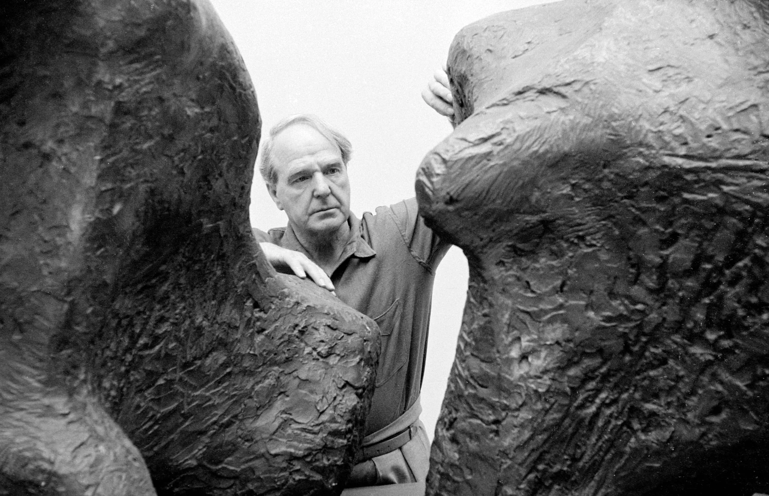 Black and white photograph of a man standing between two large, heavily textured sculptural forms, his hands resting on their surfaces
