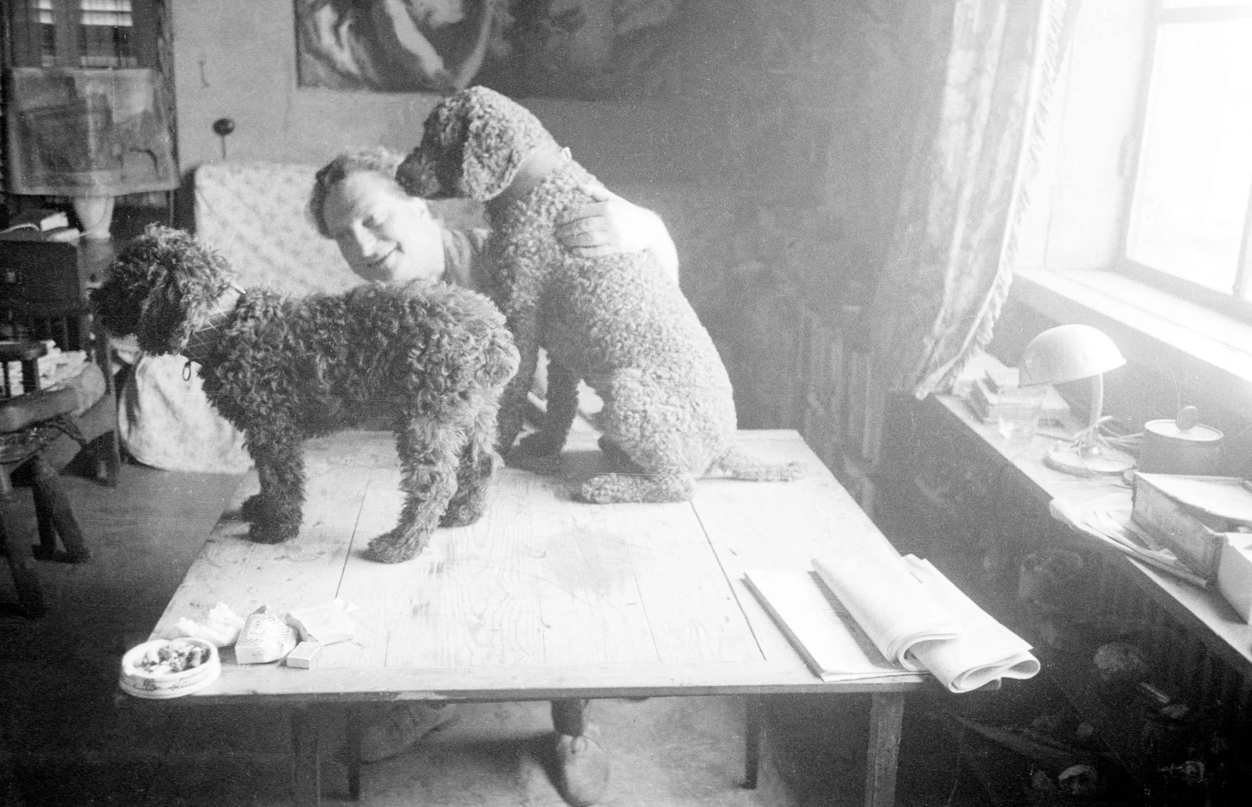 Black and white photograph of two curly-coated dogs standing on a large worktable, with a smiling man visible between them in a cluttered studio interior