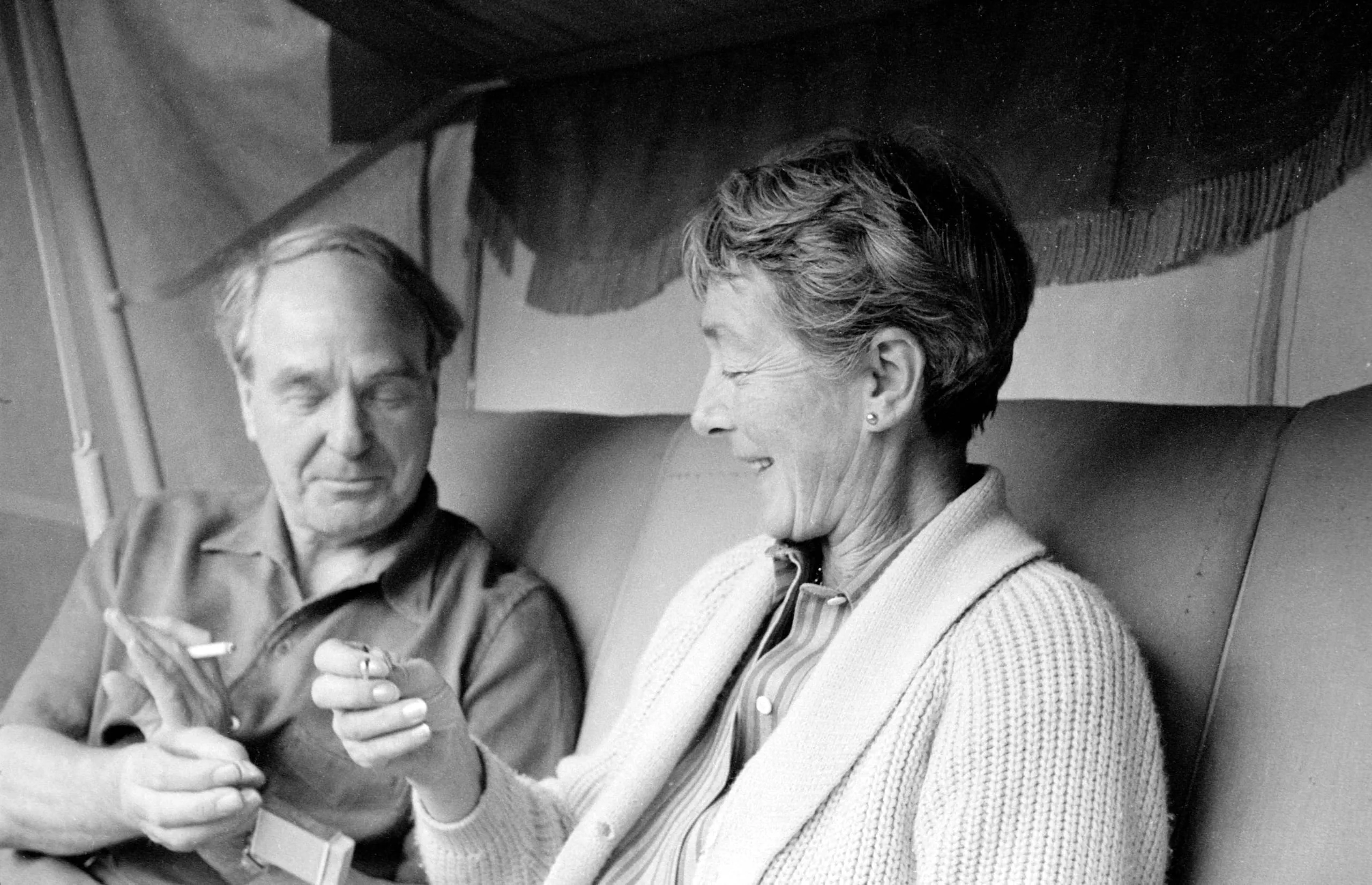 Black and white photograph of a man and woman seated together inside a tent, both looking downward, soft diffused lighting