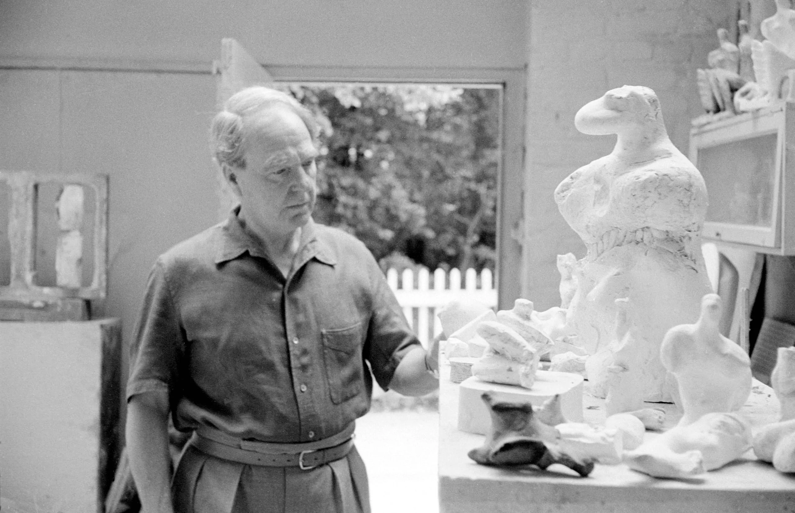 Black and white photograph of an older white man in a belted shirt standing beside a tall plaster sculpture in an artist's studio