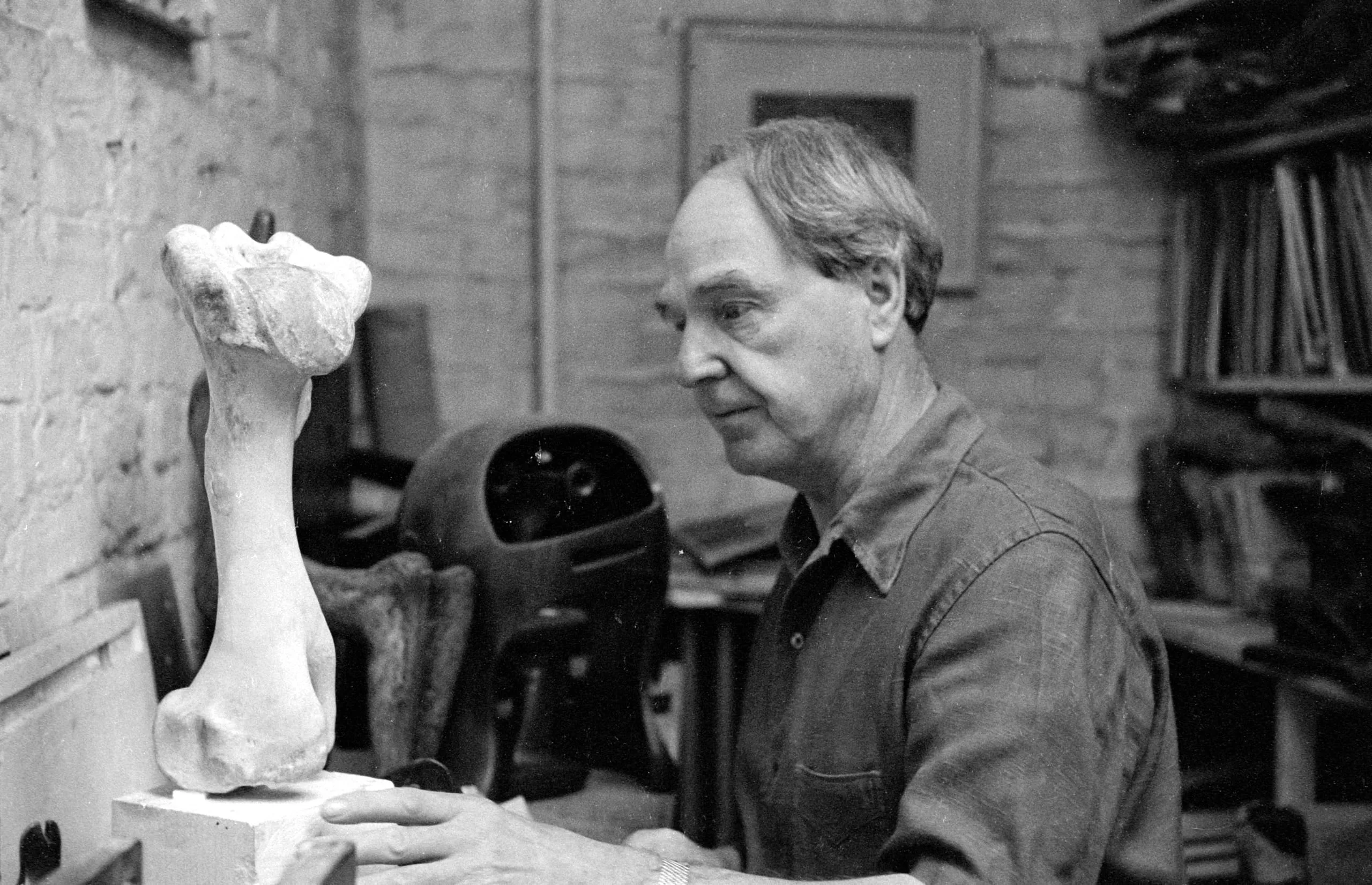 Black and white photograph of a man seated at a worktable in an artist's studio, examining a pale abstract plaster sculpture