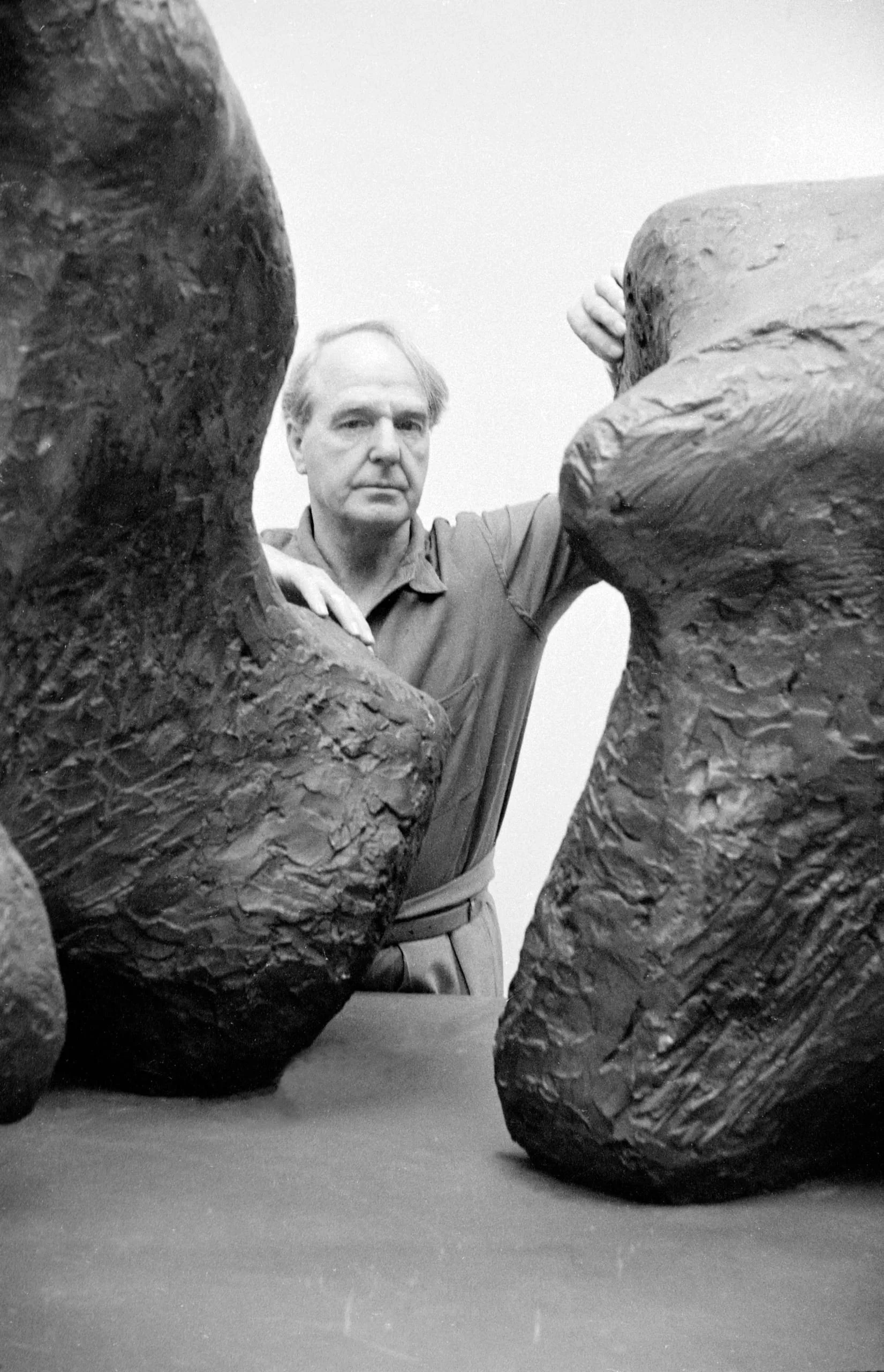 Black and white photograph of a man standing between two large, rough-textured, rounded sculptural forms in a studio or gallery setting