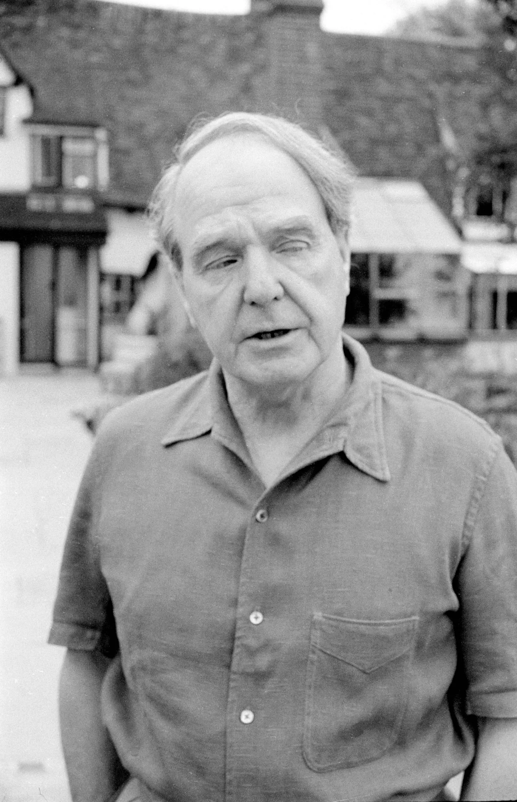 Black and white photograph, waist-up portrait of an older white man in a short-sleeved camp shirt, looking to the left, with blurred buildings behind him