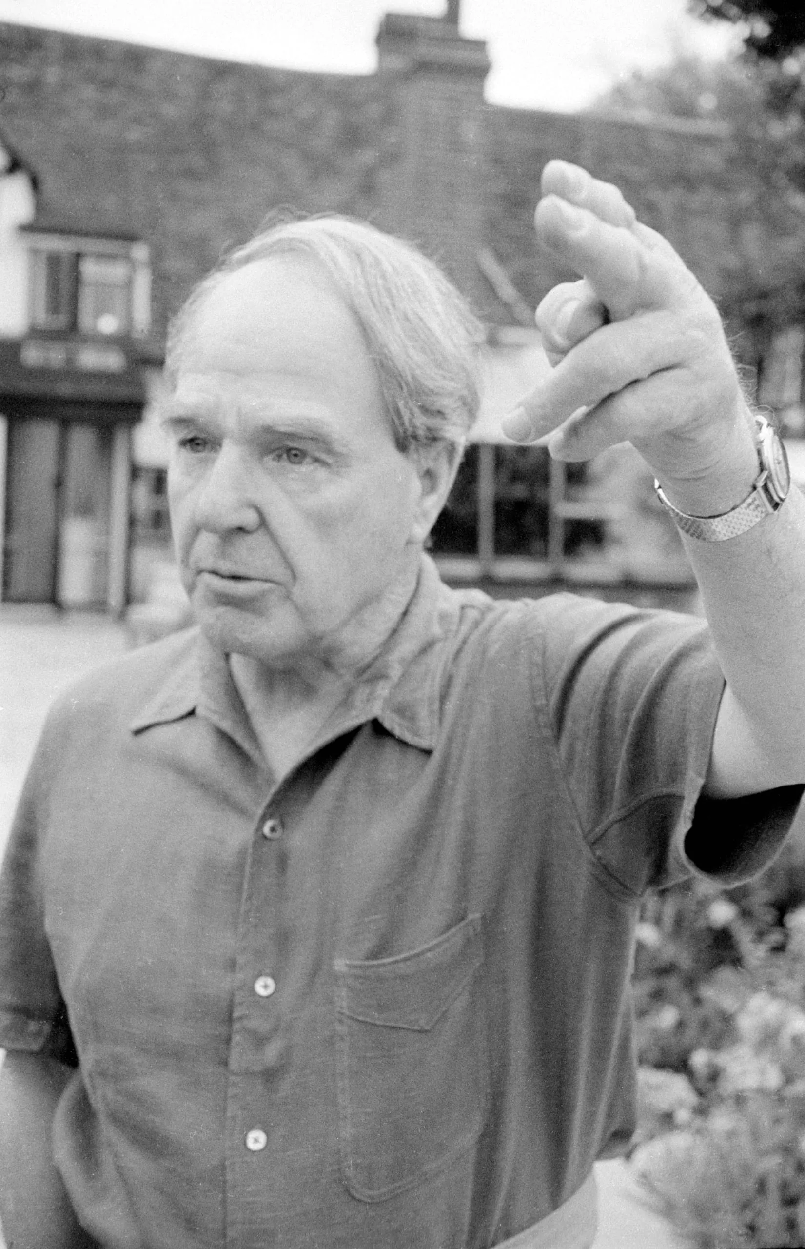 Black and white photograph of an older white man from the waist up, outdoors, raising one hand above his head with fingers loosely curled, a timber-framed building behind him
