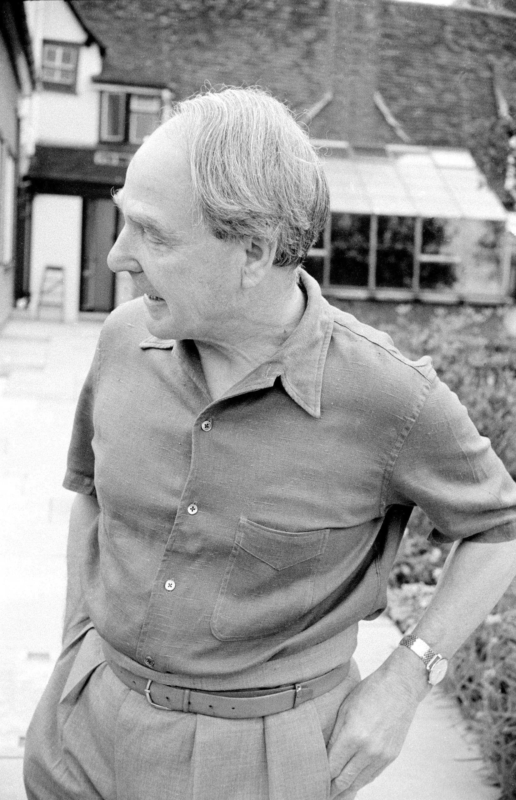 Black and white photograph, older white man in profile facing left, wearing a short-sleeved collared shirt and belted trousers, standing outdoors near a timber-framed building
