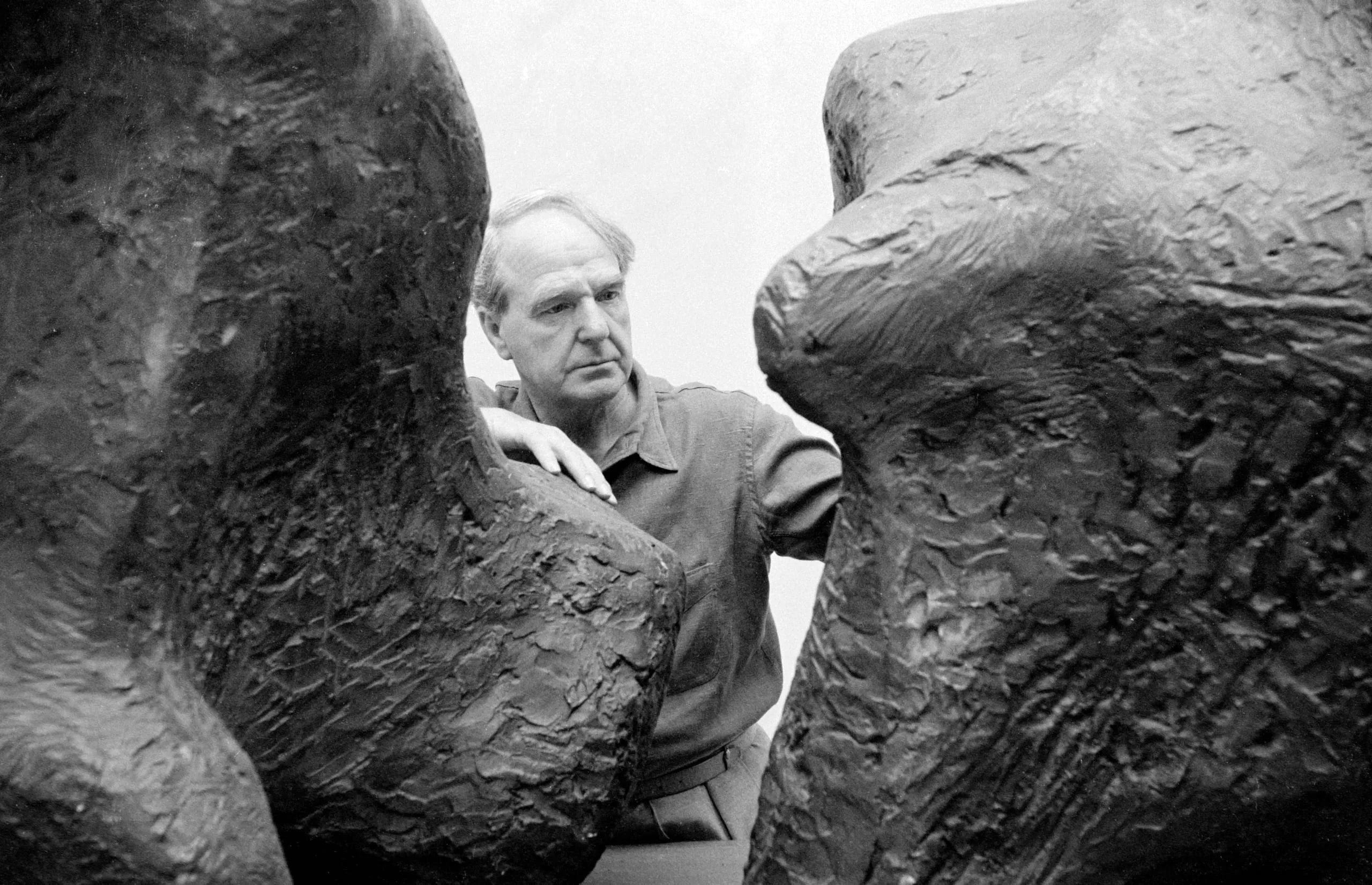 Black and white photograph of a man standing between two large, rough-textured abstract sculptures, resting one hand on the nearer form