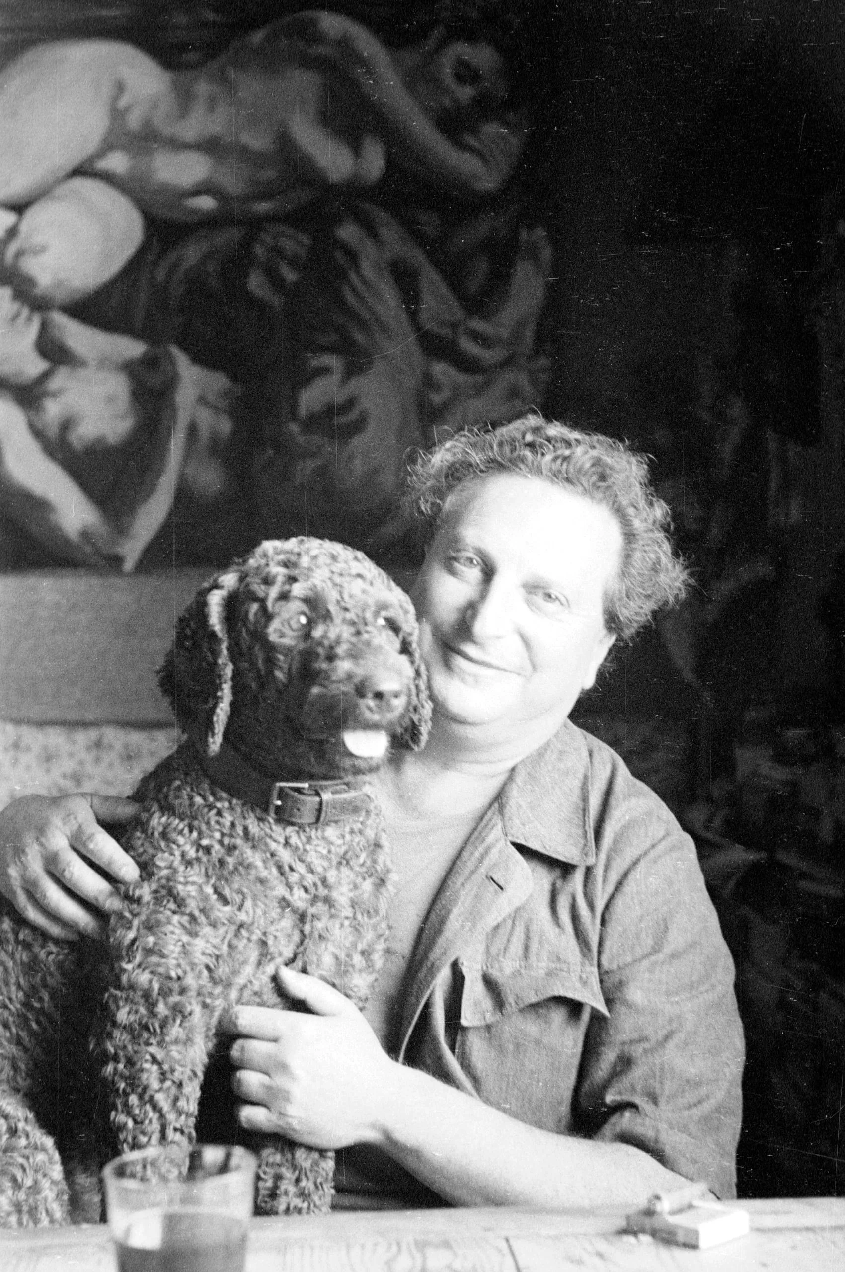 Black and white photograph of a smiling white man with curly hair embracing a curly-coated dog at a table, a large painting visible in the background