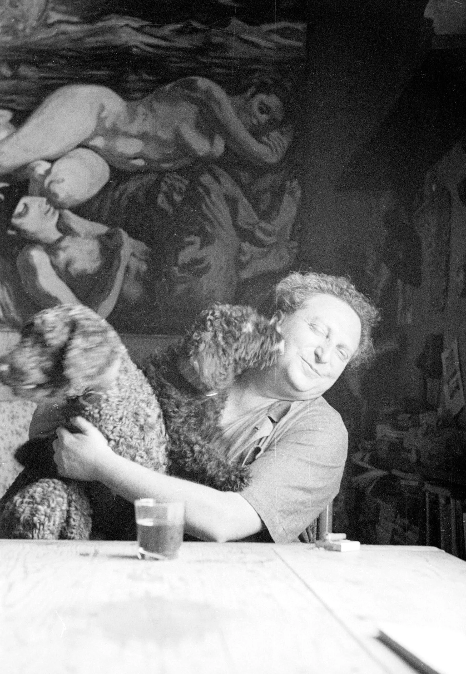 Black and white photograph of a curly-haired woman sitting at a table, laughing as a large curly-haired dog licks her face, large figurative paintings visible on the wall behind her