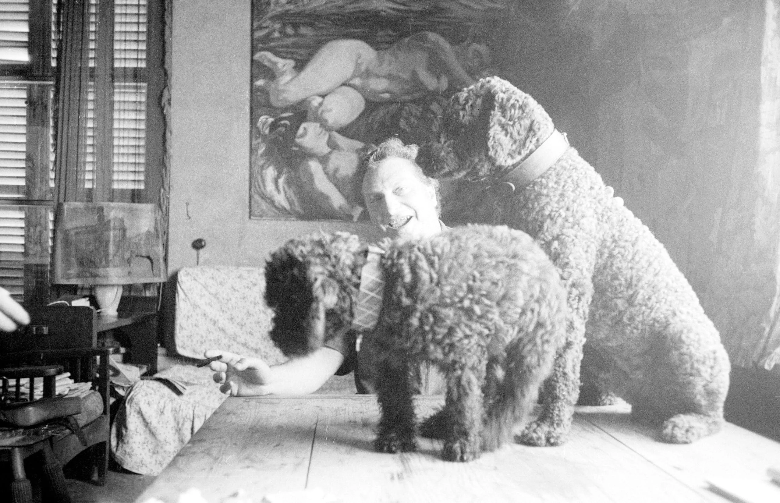 Black and white photograph of a person lying on a wood floor, laughing, surrounded by two large curly-coated dogs in a studio interior with a figurative painting on the wall behind