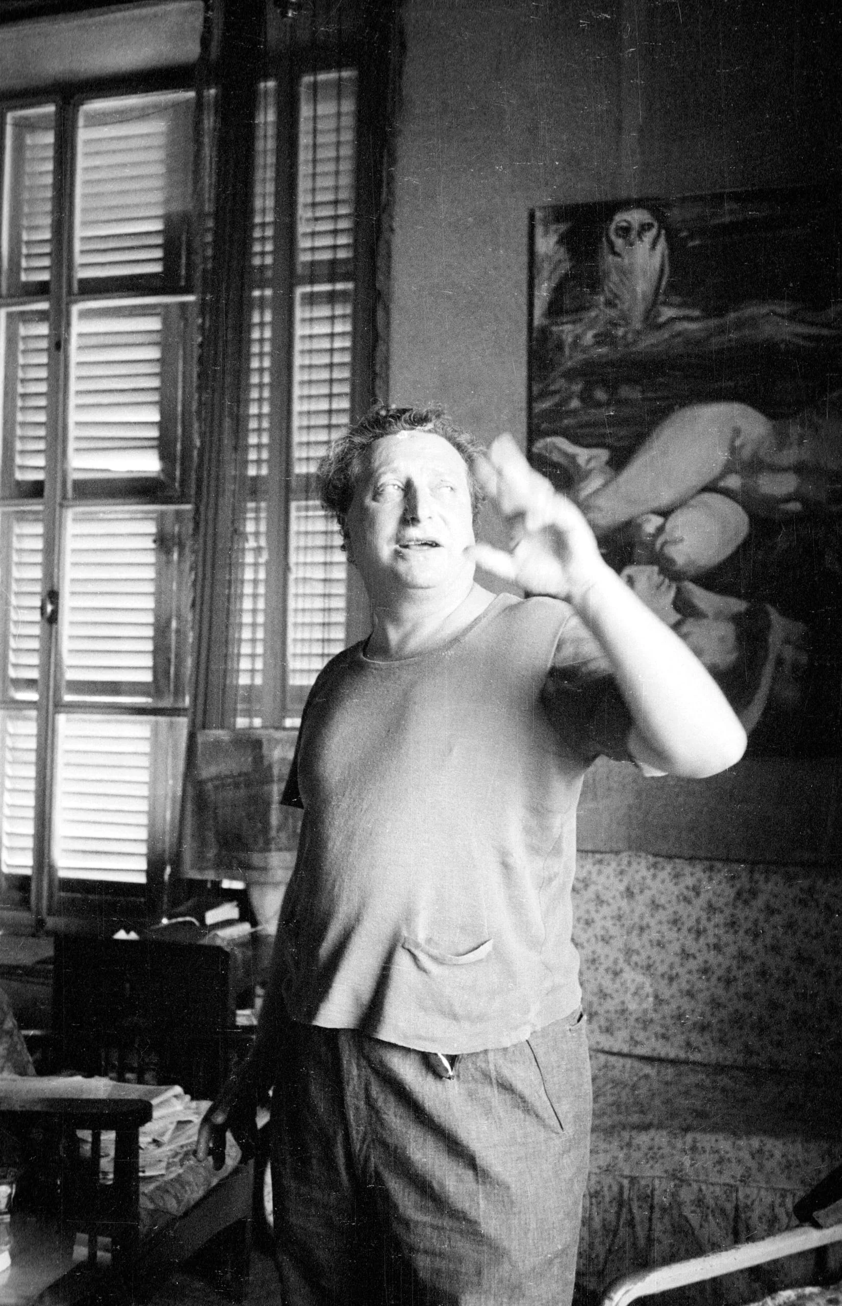 Black and white photograph of a heavyset man indoors, chin raised, mouth open, right hand lifted beside his face, a large painting visible on the wall behind him