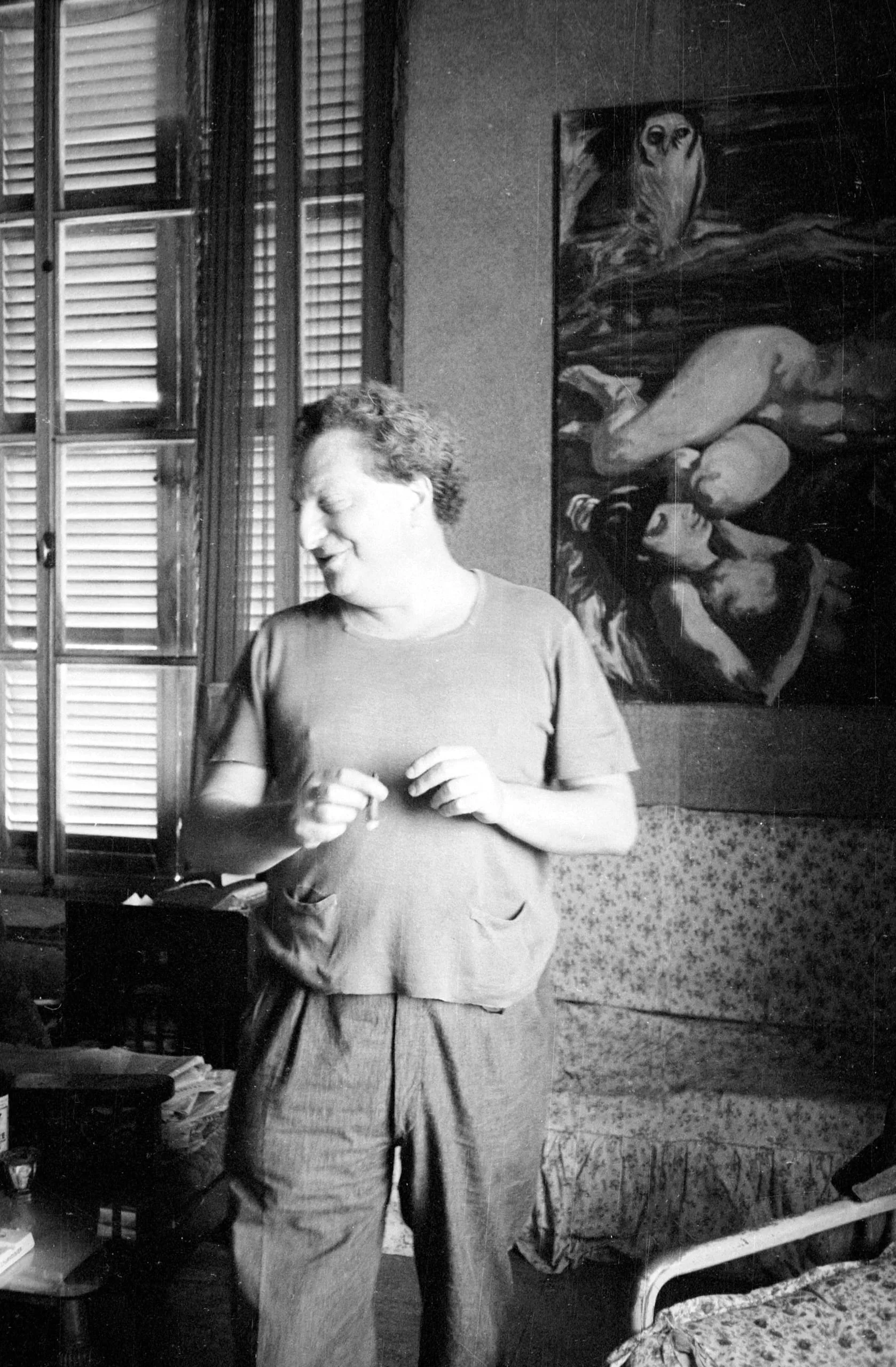 Black and white photograph of a heavyset man in a T-shirt and wide-leg trousers standing indoors, hands raised mid-gesture, with a large figurative painting visible on the wall behind him