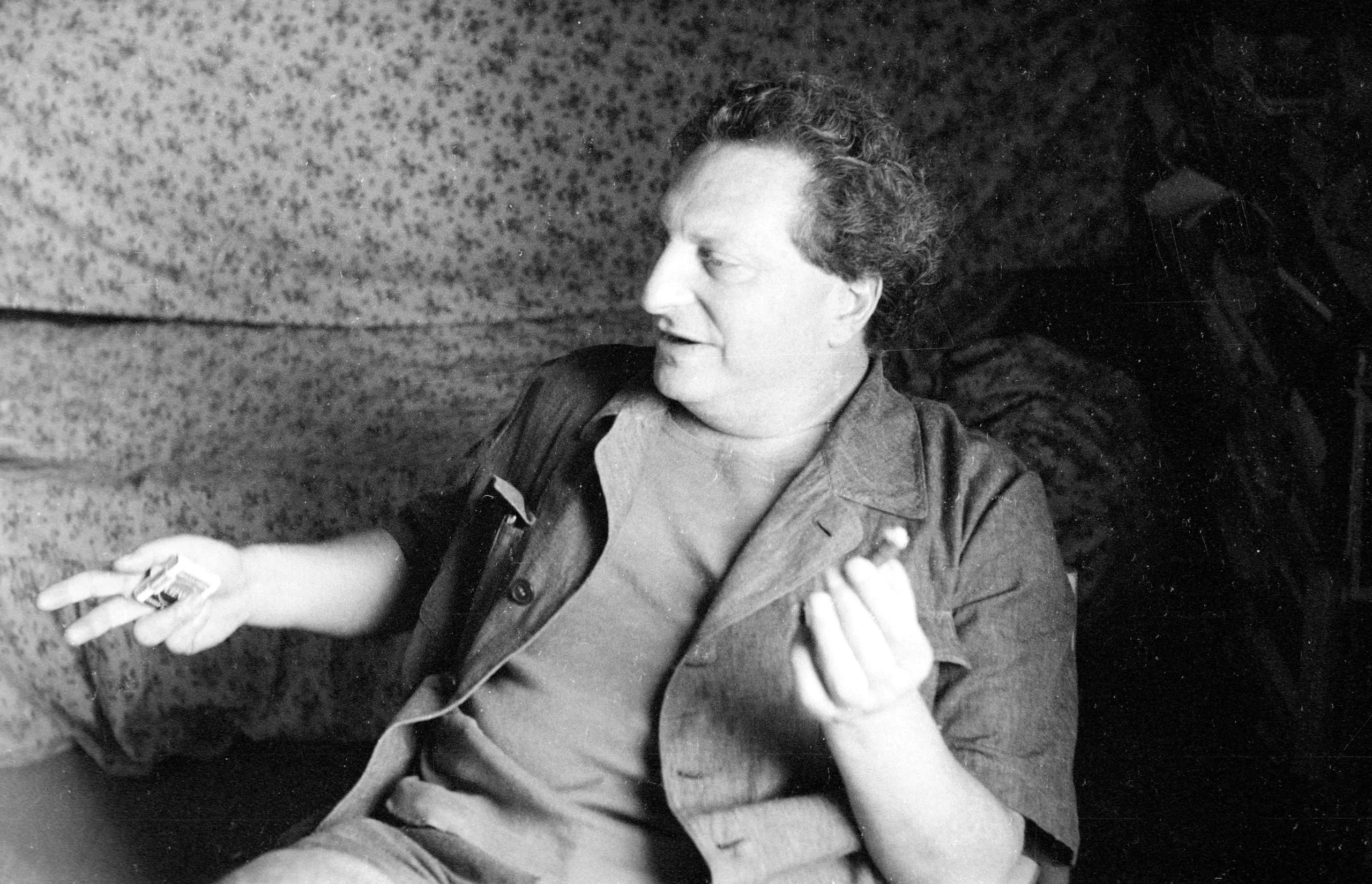 Black and white photograph of a heavyset white man seated on a floral-patterned sofa, shown from the hips up, head in profile, arms raised mid-gesture