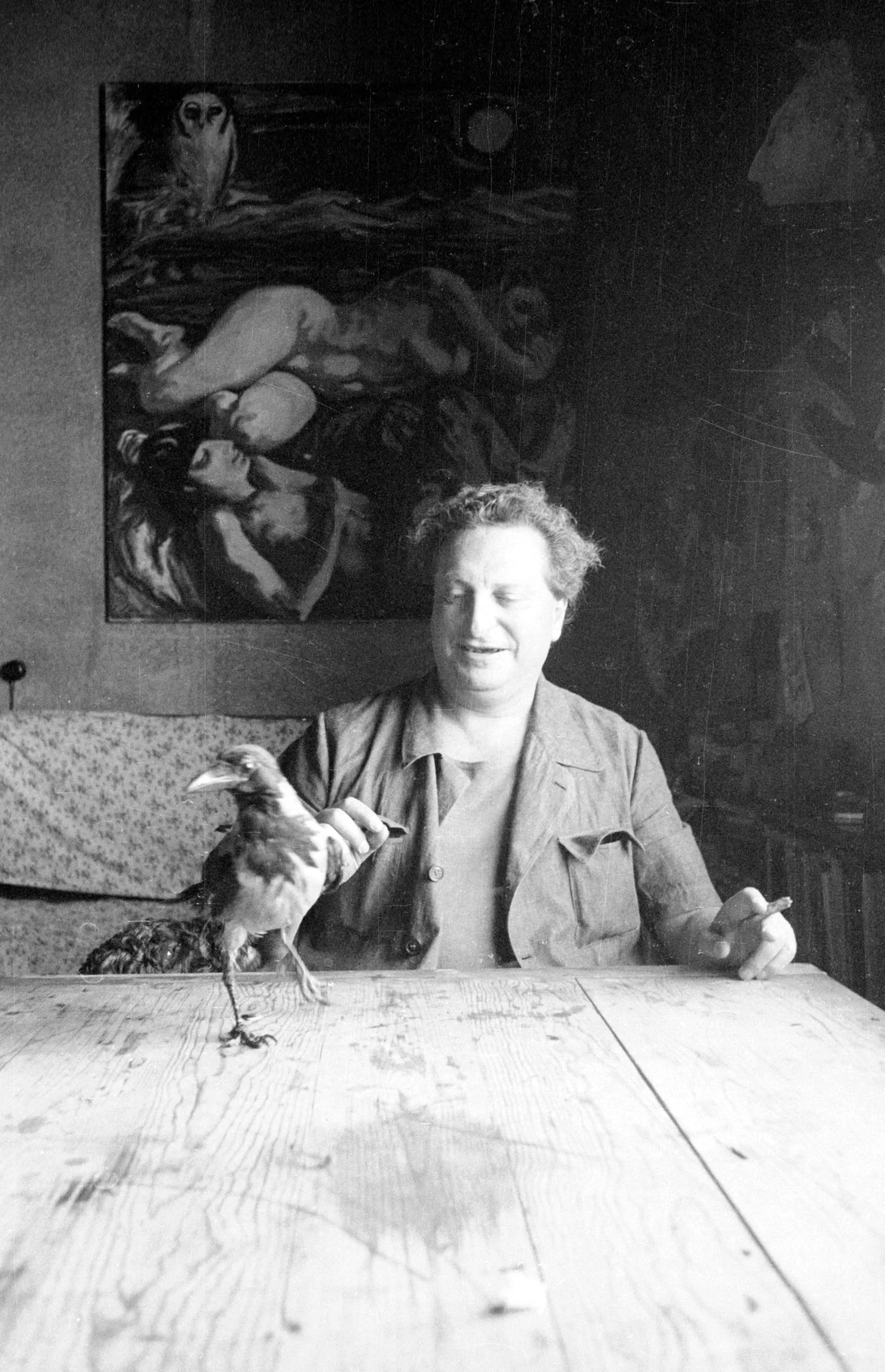 Black and white photograph of a man at a wooden table, laughing toward a small bird perched before him, a large figurative painting visible on the wall behind