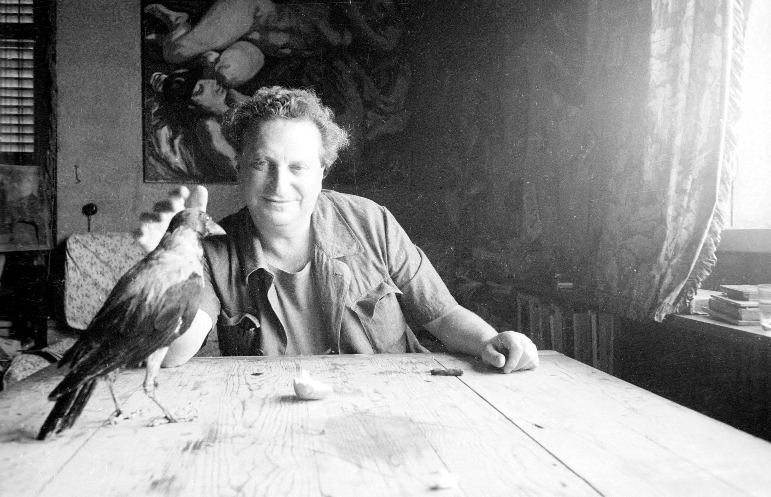 Black and white photograph of a curly-haired person seated at a wooden table, extending a hand toward a bird perched on the table's edge, a large figurative painting visible on the wall behind