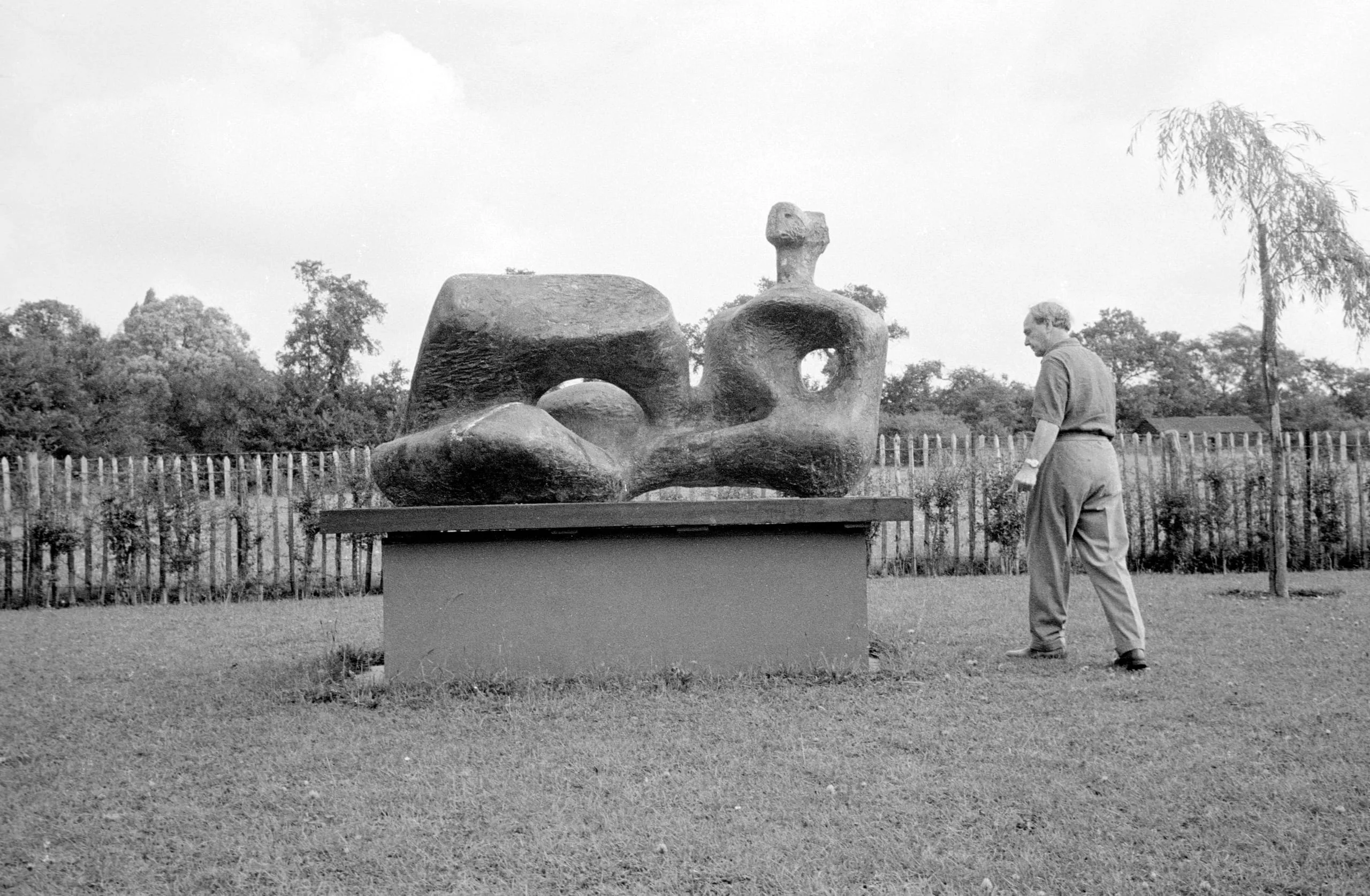 Black and white photograph of a large abstract reclining sculpture with organic forms and pierced voids on a low pedestal outdoors, with a man standing beside it
