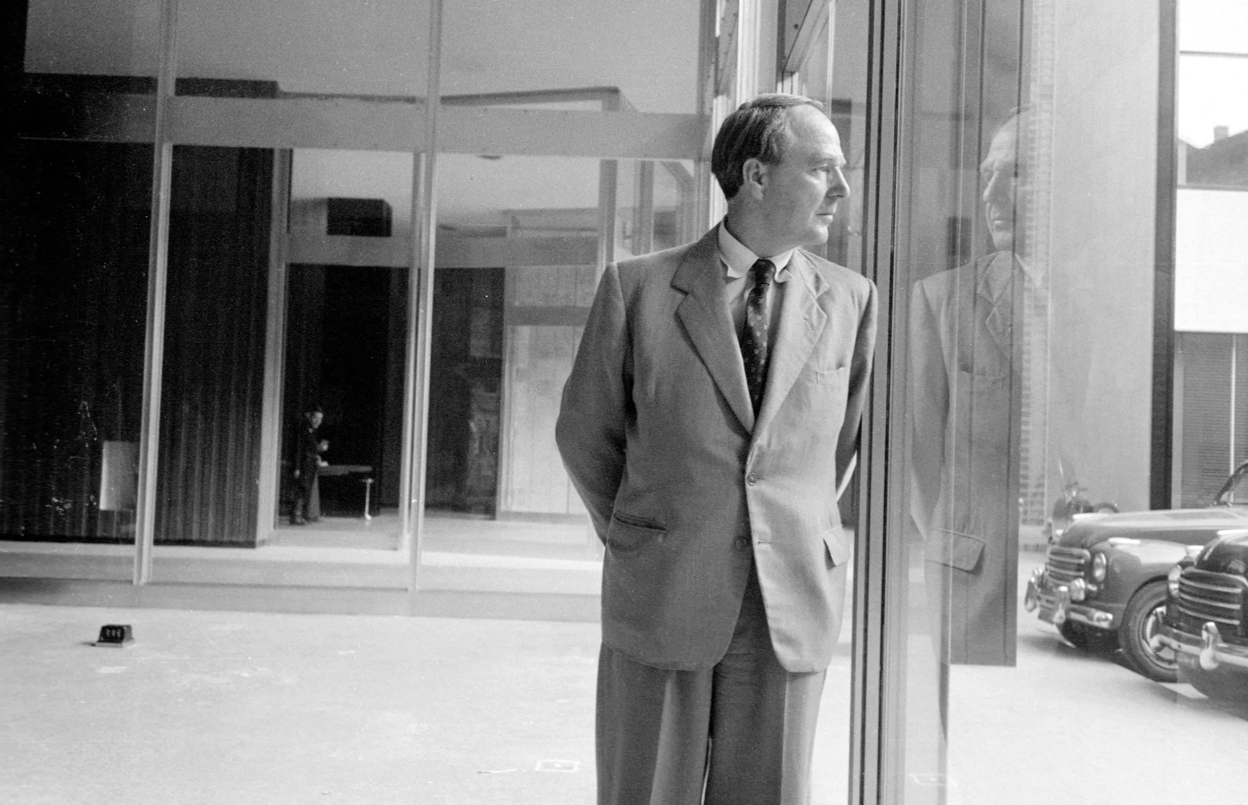 Black and white photograph of a white man in a wide-lapel suit standing beside a glass building facade, his reflection visible in the pane to his right