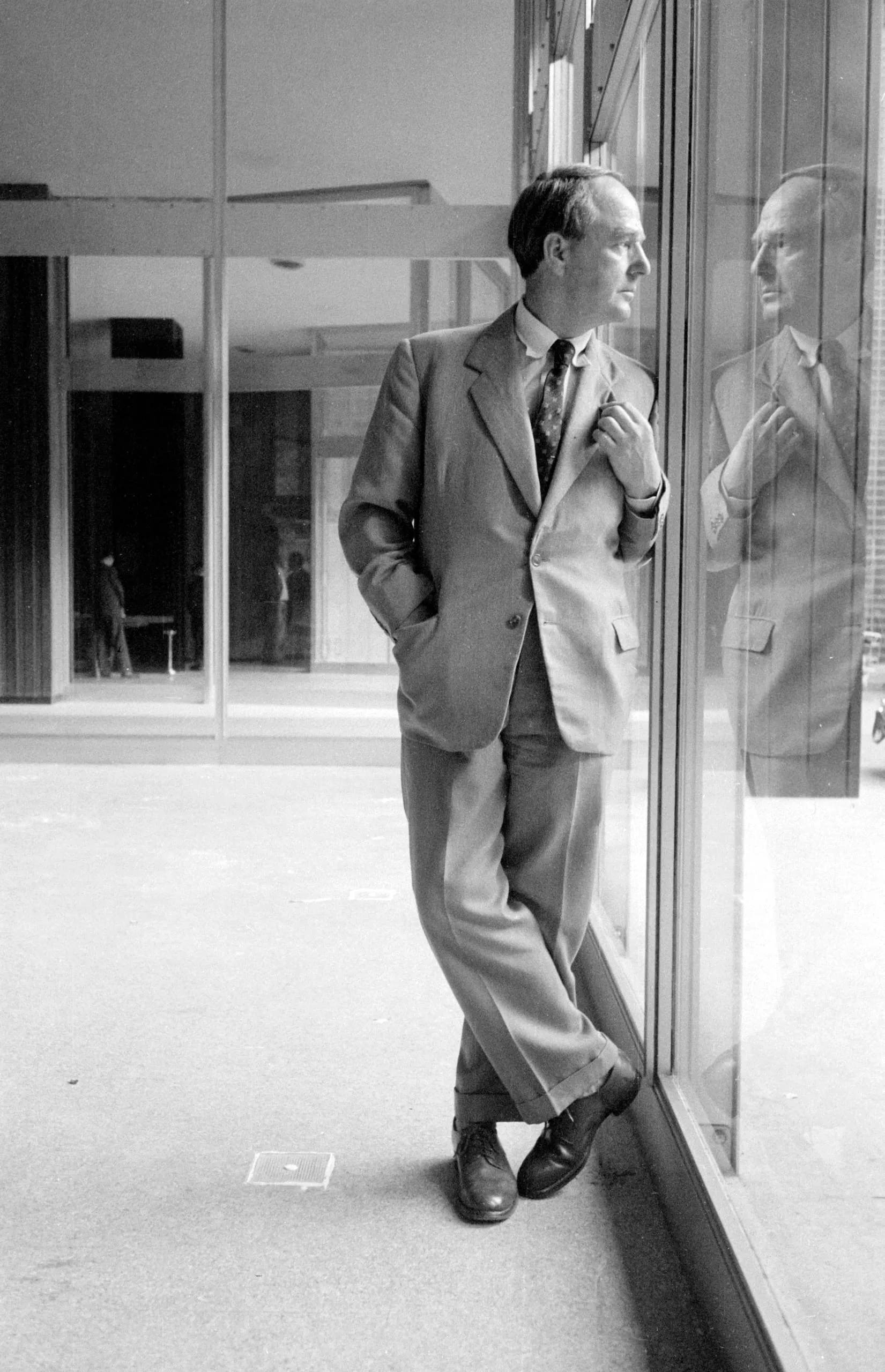 Black and white photograph of a man in a light suit leaning against a plate-glass window, full-length, his reflection visible in the glass beside him