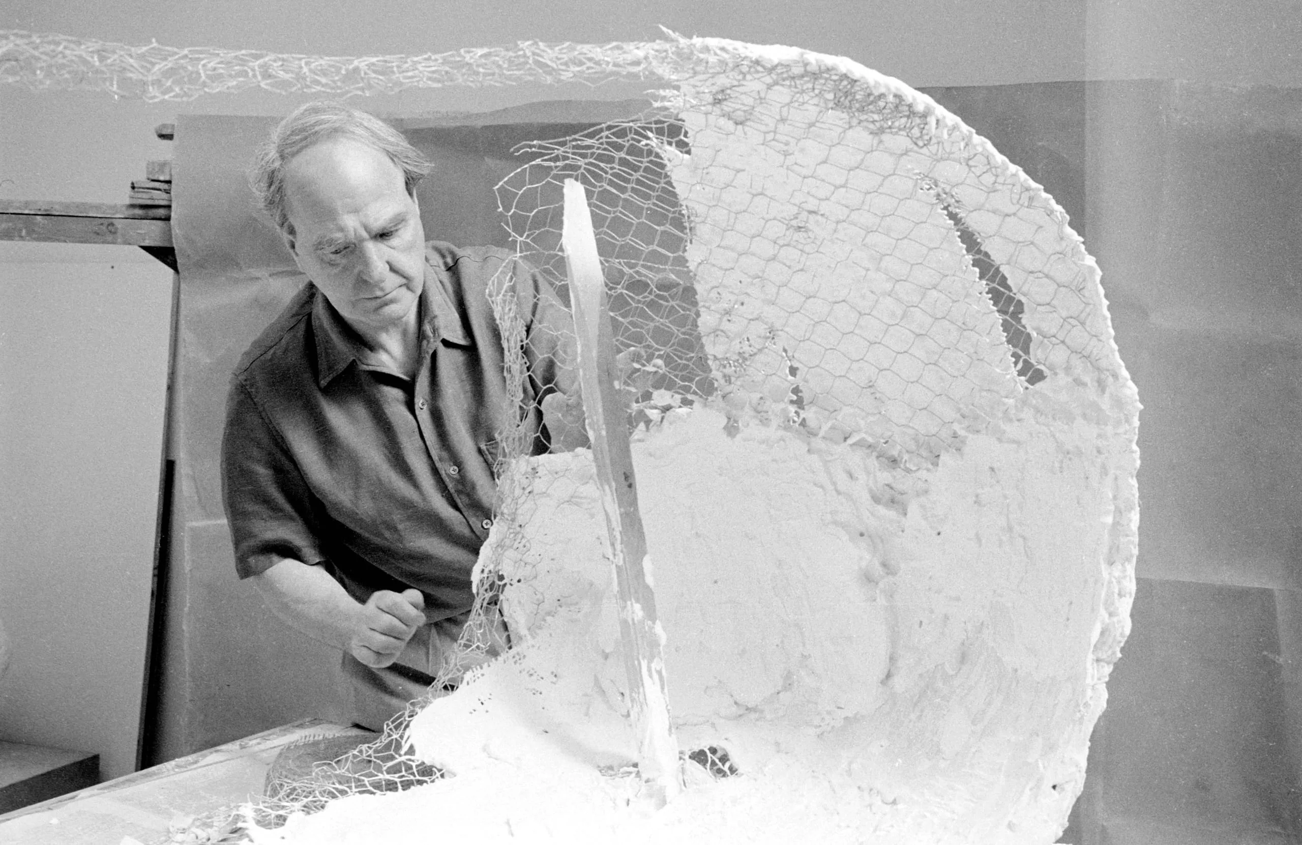 Black and white photograph of a man leaning over a large in-progress sculpture made of wire mesh and white plaster in a studio setting