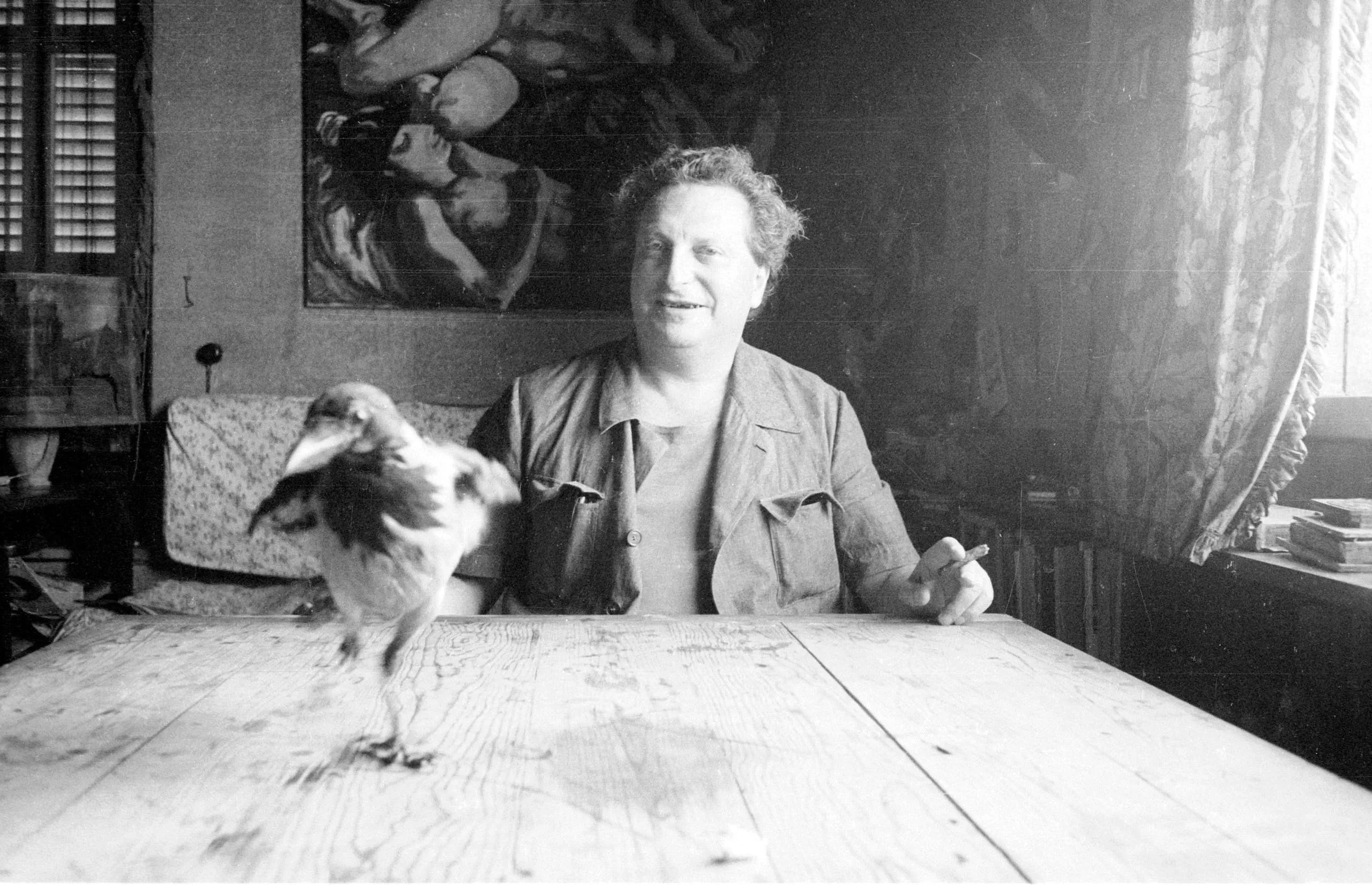 Black and white photograph of a smiling white man seated at a wide wooden table, a blurred bird perched on the table's edge in the foreground, a large painting visible on the wall behind