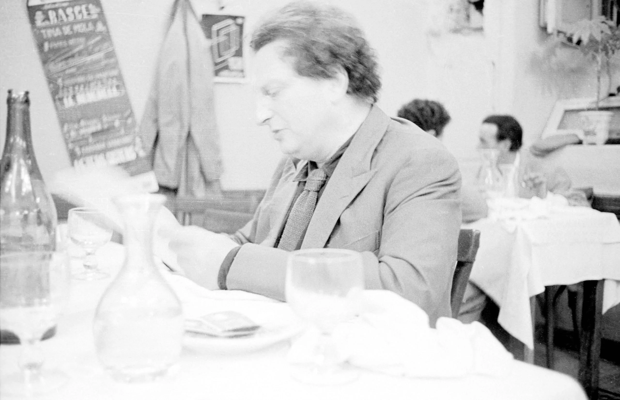 Black and white photograph of a man seated at a restaurant table, reading a paper, with glassware and a wine bottle out of focus in the foreground