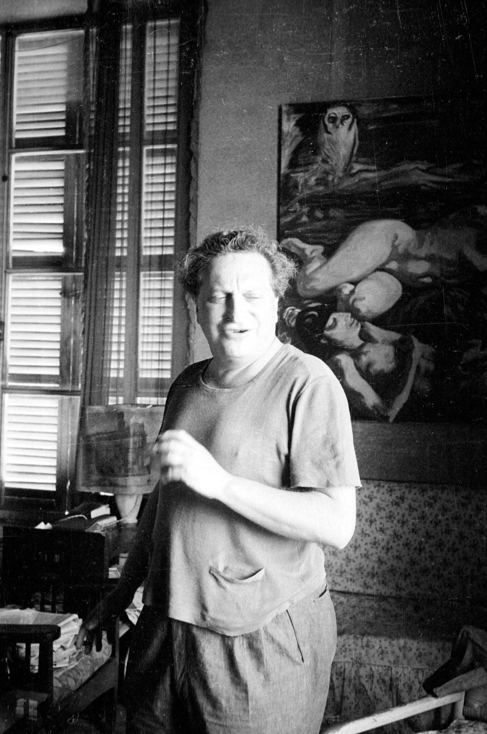 Black and white photograph of a white woman in a loose smock and trousers, standing in a cluttered interior room, holding a glass, with a large figurative painting visible behind her