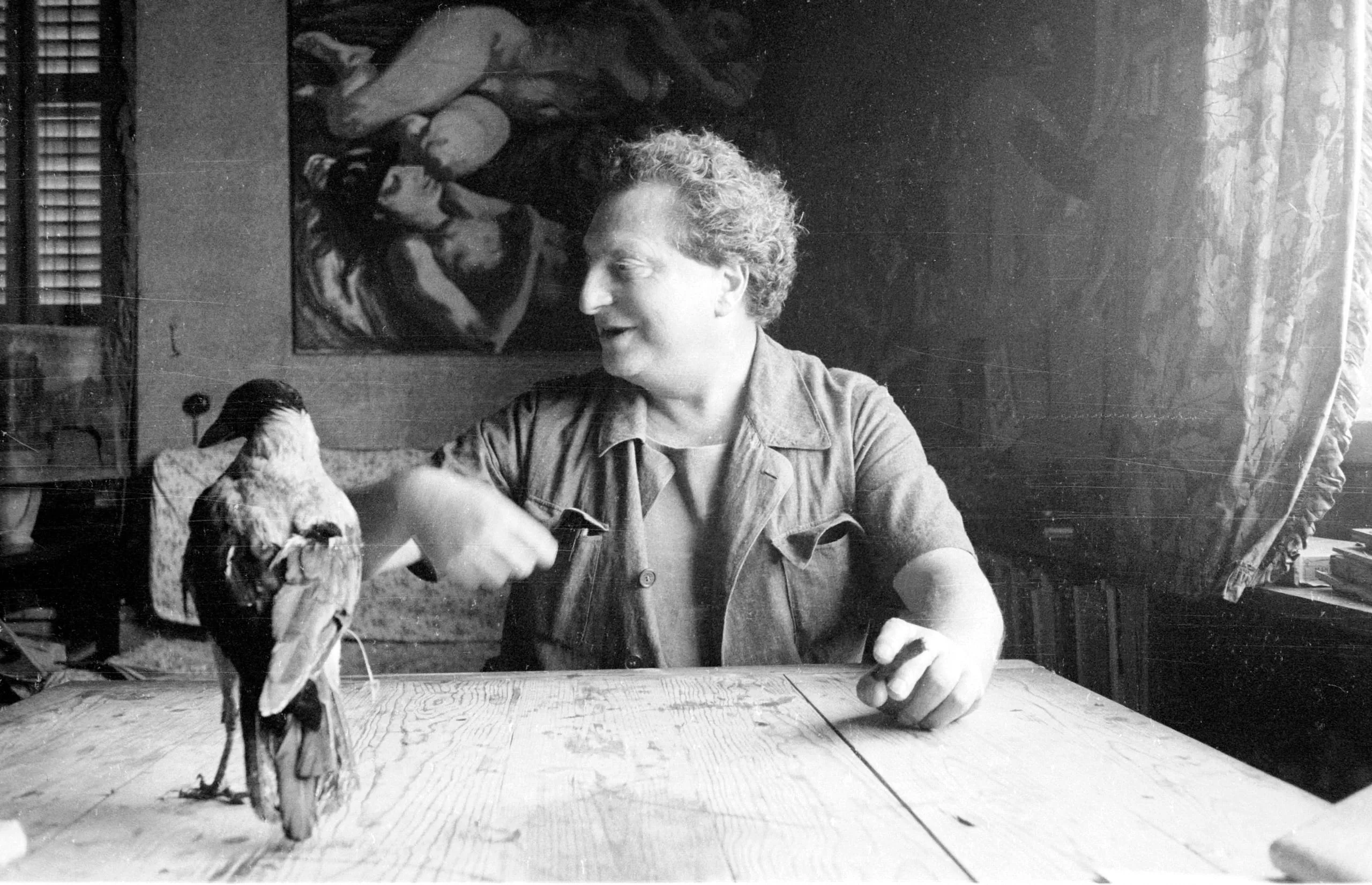 Black and white photograph of a curly-haired white man at a wooden table, pointing at a large dark-plumed bird, with a painting of reclining figures on the wall behind him
